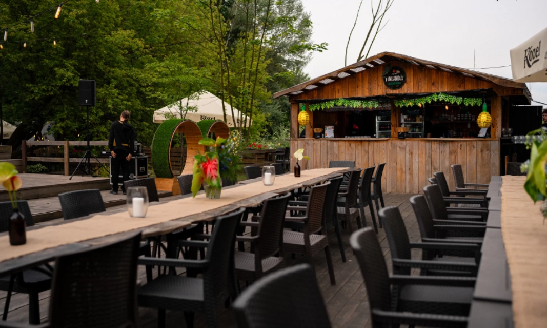 To jedno z tych miejsc, które trudno opisać, a jeszcze trudniej zapomnieć. Ogród Bez Słowa to zielona przestrzeń w stylu boho, w której czas płynie wolniej. Drewniane pomosty, strefy relaksu z hamakami i scena w otoczeniu drzew tworzą wymarzone tło dla wydarzeń plenerowych – od letnich konferencji po świąteczne spotkania przy ognisku.