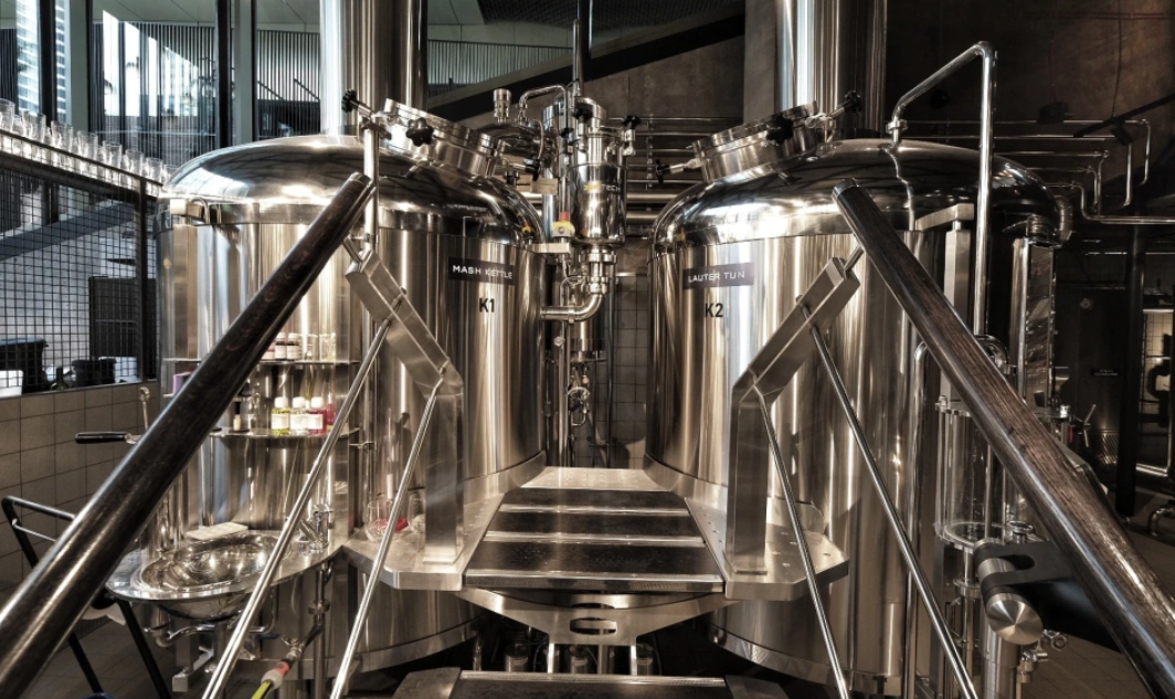 Centralne miejsce zajmuje piwny charakter obiektu – fermentory, podświetlane zbiorniki i otwarta ekspozycja browarniczej technologii budują atmosferę, której nie da się pomylić z żadnym innym miejscem.