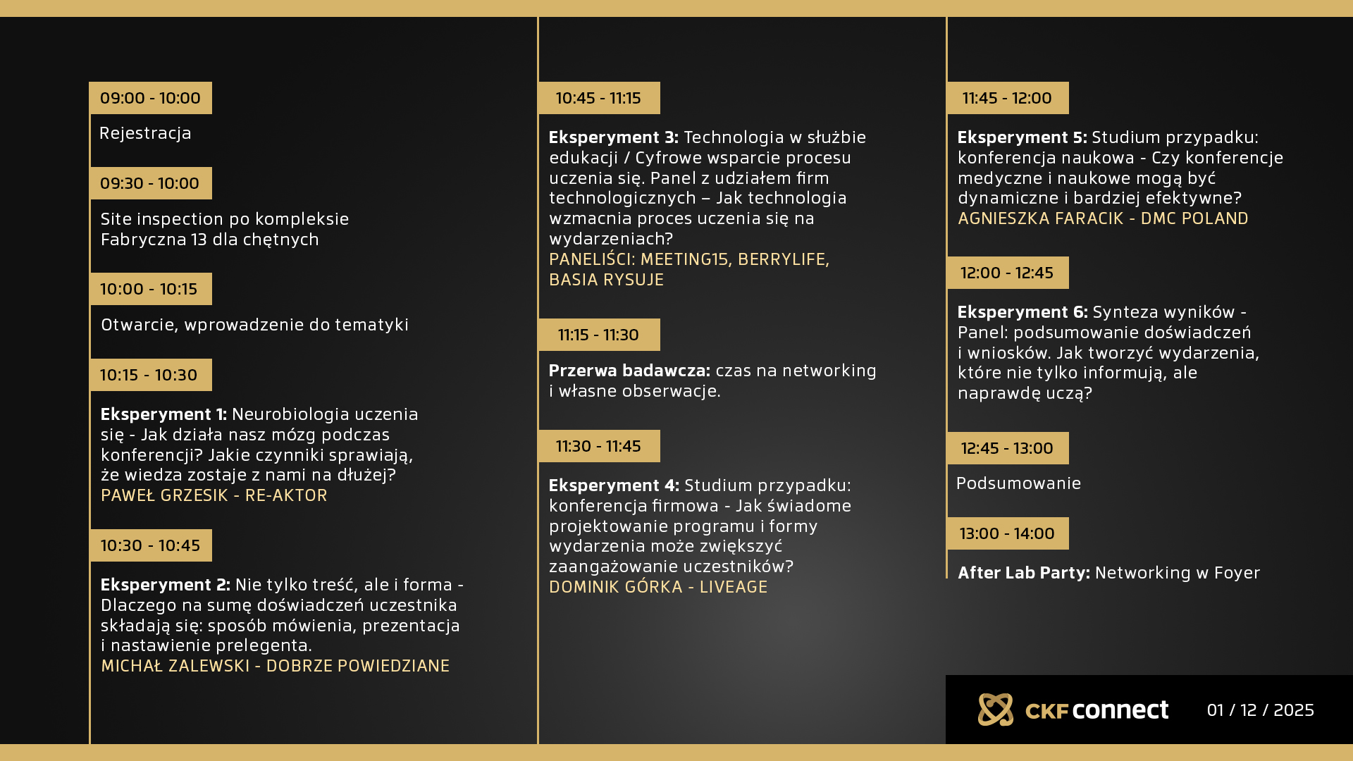 Jak podkreśla pomysłodawczyni projektu, Karolina Bednarz: „Z CKF Connect od początku zależało mi, by stworzyć wydarzenie, które nie tylko daje wartość merytoryczną, ale też buduje więzi. Branża eventowa potrzebuje przestrzeni, gdzie różne strony – klient, wykonawca, obiekt – mogą naprawdę się zrozumieć”.