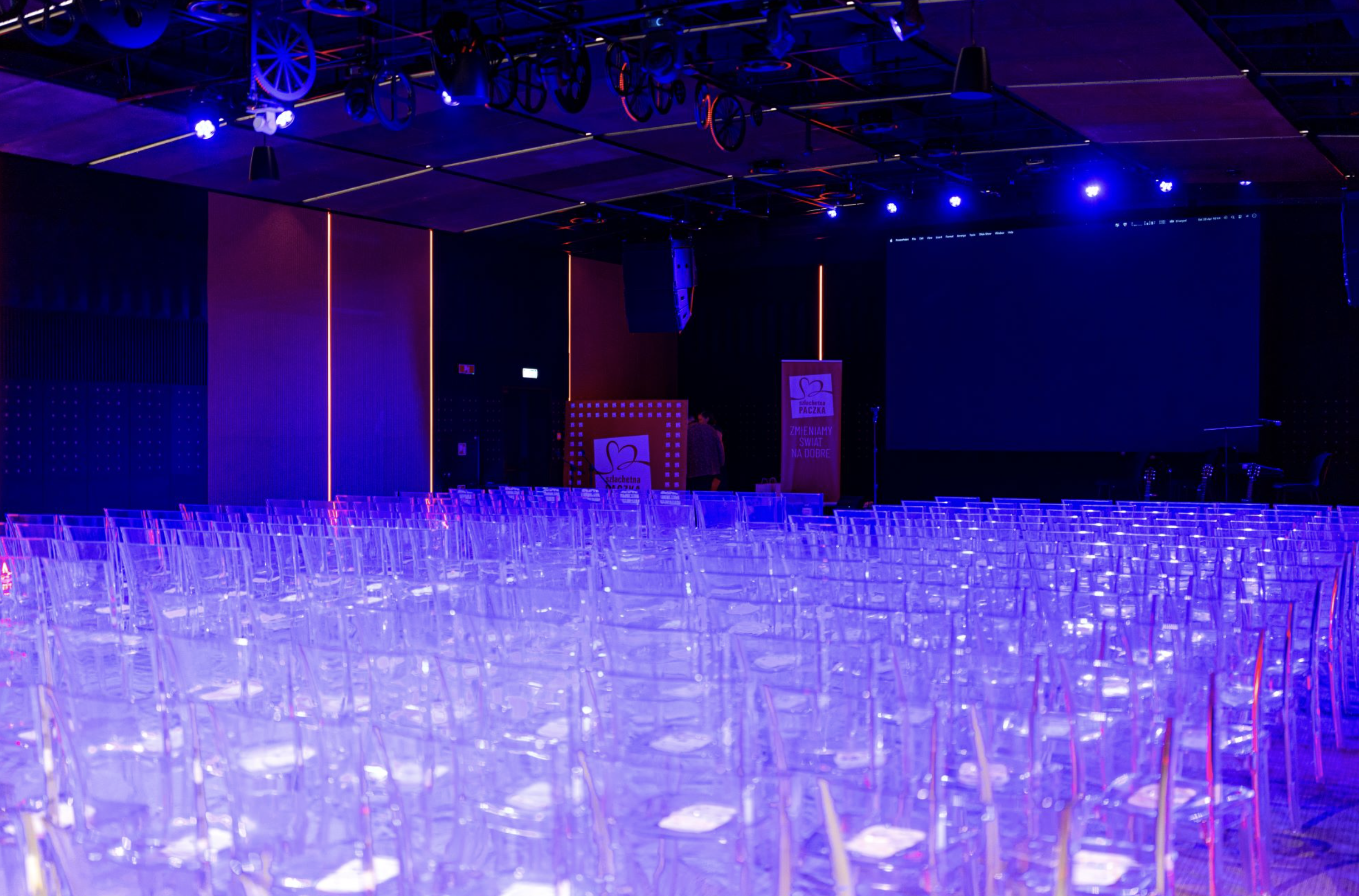 Na wyposażeniu znajdują się między innymi duży ekran diodowy, dodatkowe składane ekrany, profesjonalne nagłośnienie oraz rozbudowany system oświetlenia - zarówno technicznego, jak i dekoracyjnego. Całość uzupełniają mikrofony oraz podświetlane elementy scenografii, które podnoszą jakość prezentacji i wystąpień.