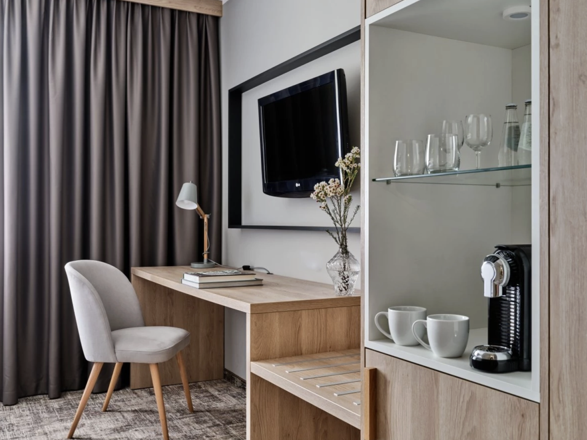 Goście mają do dyspozycji klimatyzację, szybki internet, przestrzeń do pracy oraz wyposażenie, które pozwala na komfortowy pobyt zarówno podczas krótkich wizyt, jak i dłuższych wydarzeń. Zróżnicowany standard pokoi umożliwia dopasowanie oferty do potrzeb różnych grup uczestników.