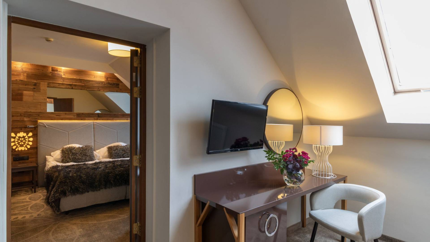 SANDRA SPA oferuje 550 miejsc noclegowych, rozmieszczonych w 260 pokojach jedno-, dwu- oraz trzyosobowych, a także w stylowych apartamentach i pokojach typu studio. Jasne i przestronne wnętrza, urządzone w eleganckim stylu z gustownymi dodatkami i ciepłymi kolorami, sprawiają, że każde pomieszczenie emanuje przytulnością. Wszystkie pokoje zostały starannie wyposażone w komfortową łazienkę, telewizor, telefon, sejf i mini-bar. Wygodne meble oraz niezbędne sprzęty gwarantują doskonały wypoczynek. Ponadto z każdego pokoju rozpościera się zapierający dech w piersiach widok na malowniczy Karpacz, co z pewnością umili pobyt wszystkim gościom.