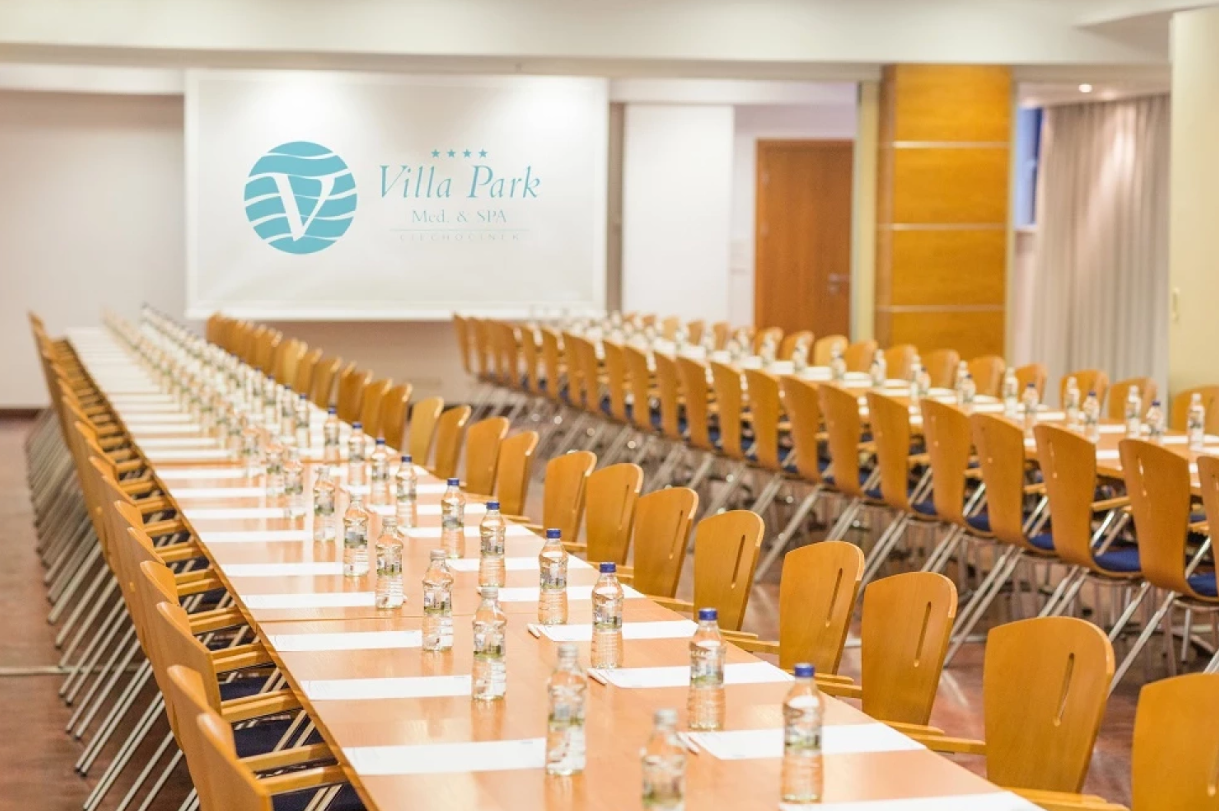 W Villa Park MED & SPA stworzono nowoczesne zaplecze konferencyjne, które bez trudu sprosta zarówno mniejszym naradom, jak i większym, kilkudziesięcioosobowym szkoleniom. Do dyspozycji organizatorów przygotowano sześć komfortowych, estetycznie zaaranżowanych sal konferencyjnych o powierzchni od 30 do 100 m². Trzy Sale Parkowe można dowolnie łączyć, tworząc nawet 200 m² funkcjonalnej, otwartej przestrzeni, idealnej na większe wydarzenia firmowe.