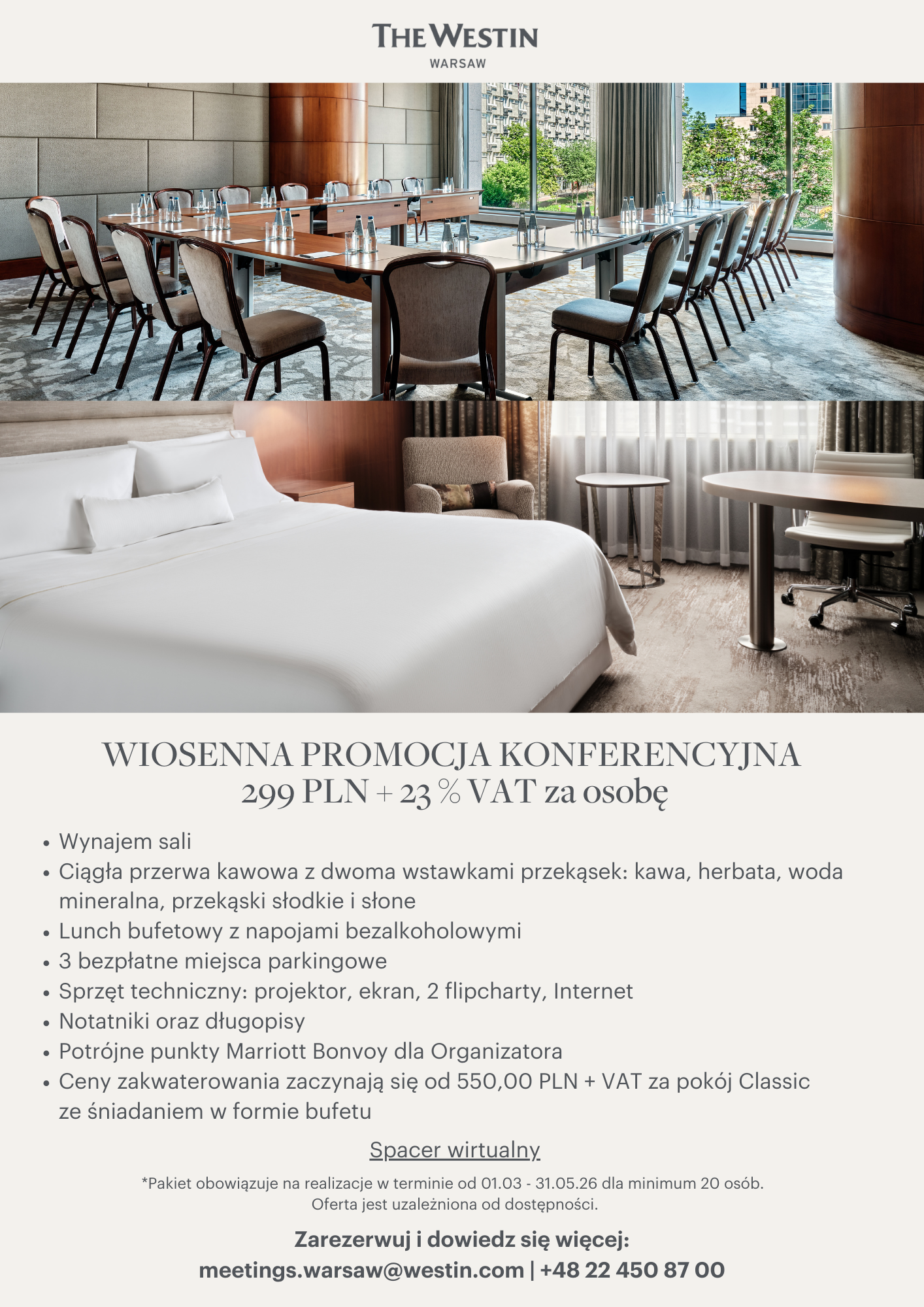 Warszawa od lat przyciąga organizatorów wydarzeń biznesowych z całej Polski i Europy. Dynamiczne tempo miasta, świetna infrastruktura, nowoczesne przestrzenie eventowe - to dlatego stolica pozostaje jednym z najważniejszych punktów na mapie branży MICE! Wśród miejsc szczególnie cenionych przez organizatorów znajduje się The Westin Warsaw - pięciogwiazdkowy hotel, który oferuje prestiż, nowoczesną architekturę i profesjonalne zaplecze konferencyjne.