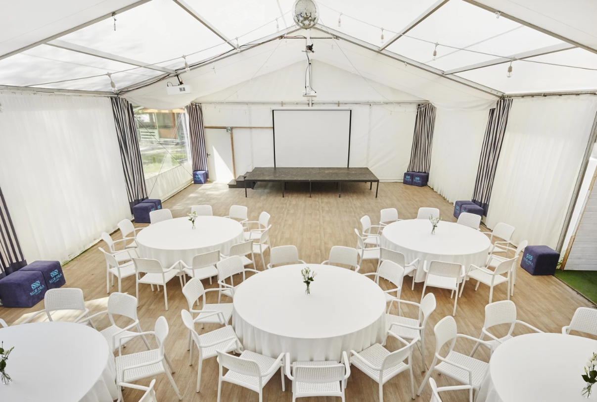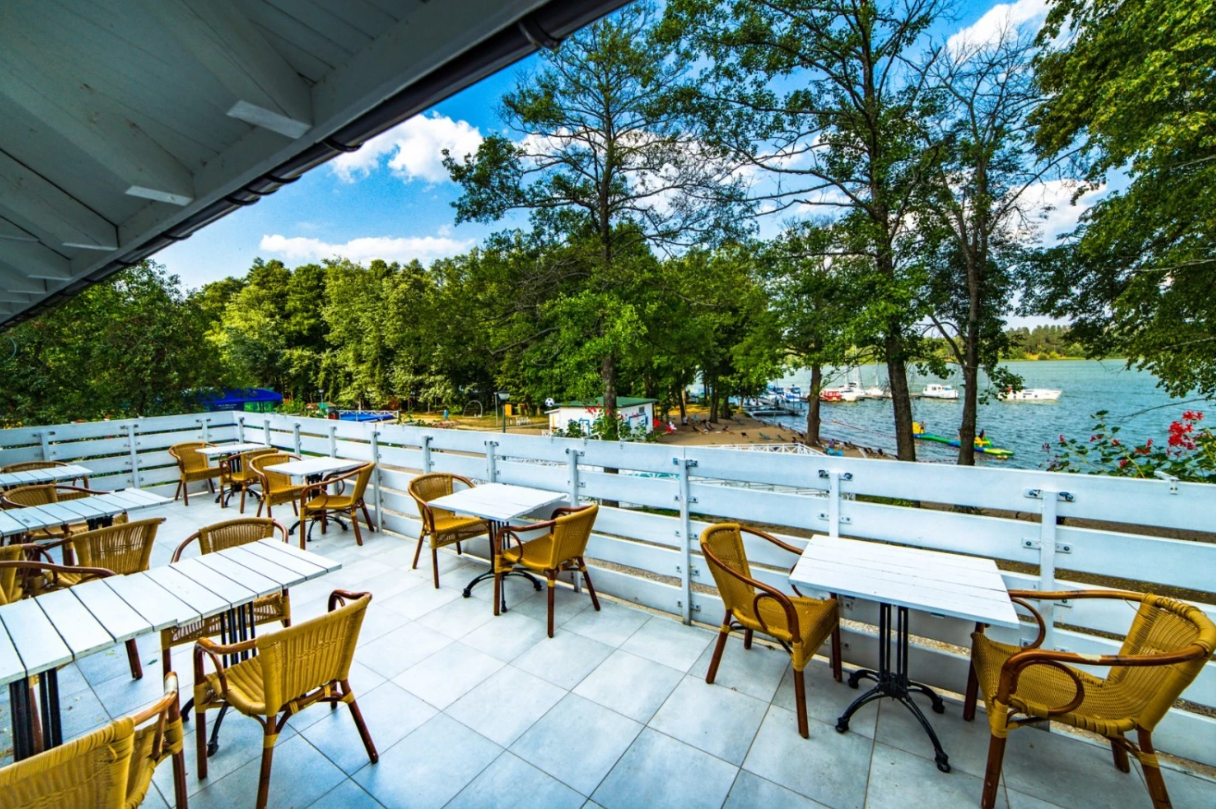 Na większe uroczystości znakomicie nadaje się Namiot Bankietowy o powierzchni 135 m² z mobilną sceną – przestrzeń elastyczna i gotowa pomieścić zarówno wystąpienia prelegentów, jak i koncerty czy bankiety firmowe. Restauracyjne sale z możliwością przyjęcia do 250 osób oraz zadaszony taras z widokiem na jezioro tworzą wyjątkową oprawę dla eleganckich kolacji i uroczystych jubileuszy.