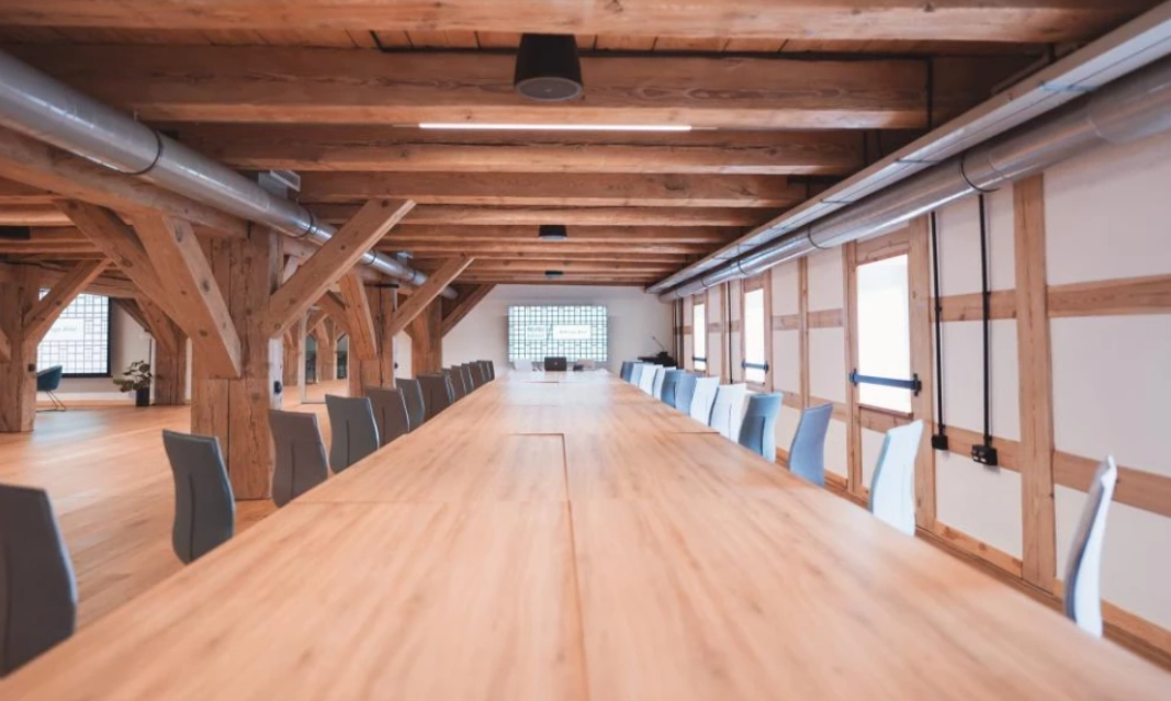 Wnętrza MONKA Młyny Rothera to prawdziwa podróż w czasie. Odrestaurowane z dbałością o każdy detal, zachowują industrialny charakter dawnego młyna, jednocześnie oferując nowoczesne rozwiązania technologiczne. Jasne, przestronne sale, ceglane ściany i ciepłe światło tworzą atmosferę sprzyjającą skupieniu, wymianie myśli i twórczej pracy.