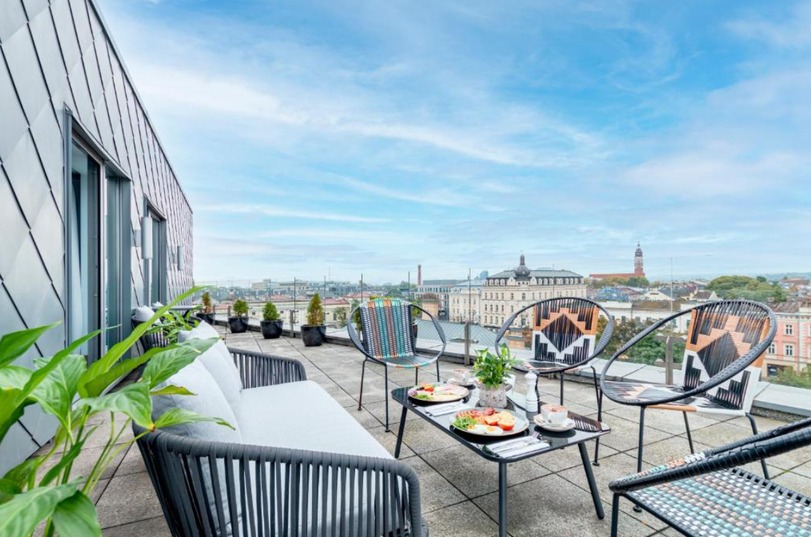 Z pokoi położonych na wyższych piętrach rozciąga się zachwycający widok na panoramę Starego Miasta – widok, który dodaje wyjątkowego charakteru każdemu porankowi.