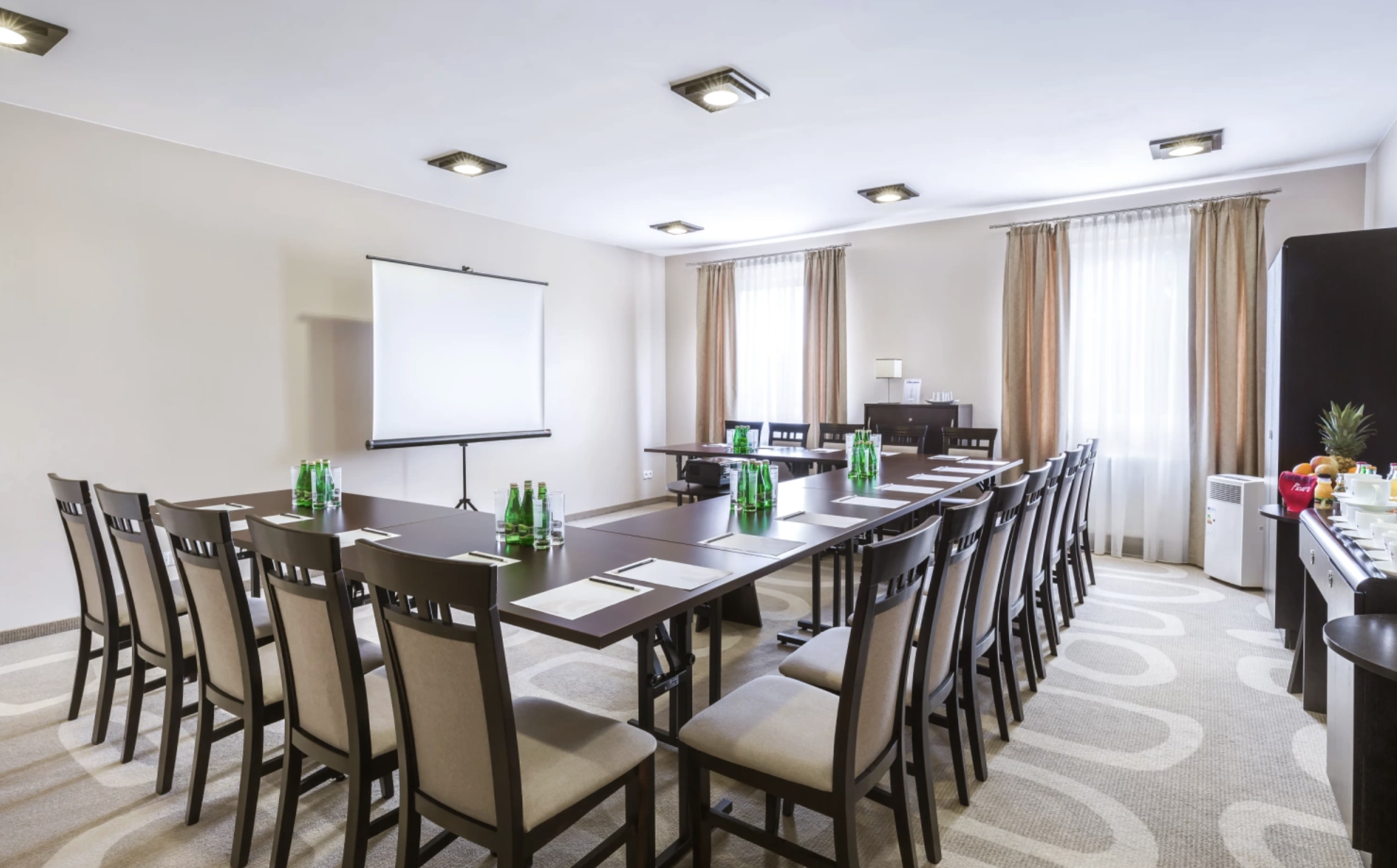 Nowoczesna sala konferencyjna w Hotelu Picaro została zaprojektowana z myślą o kameralnych spotkaniach biznesowych, szkoleniach czy prezentacjach. Przestrzeń wyposażona jest w profesjonalny sprzęt multimedialny oraz zapewnia komfortową atmosferę sprzyjającą koncentracji i twórczej pracy.