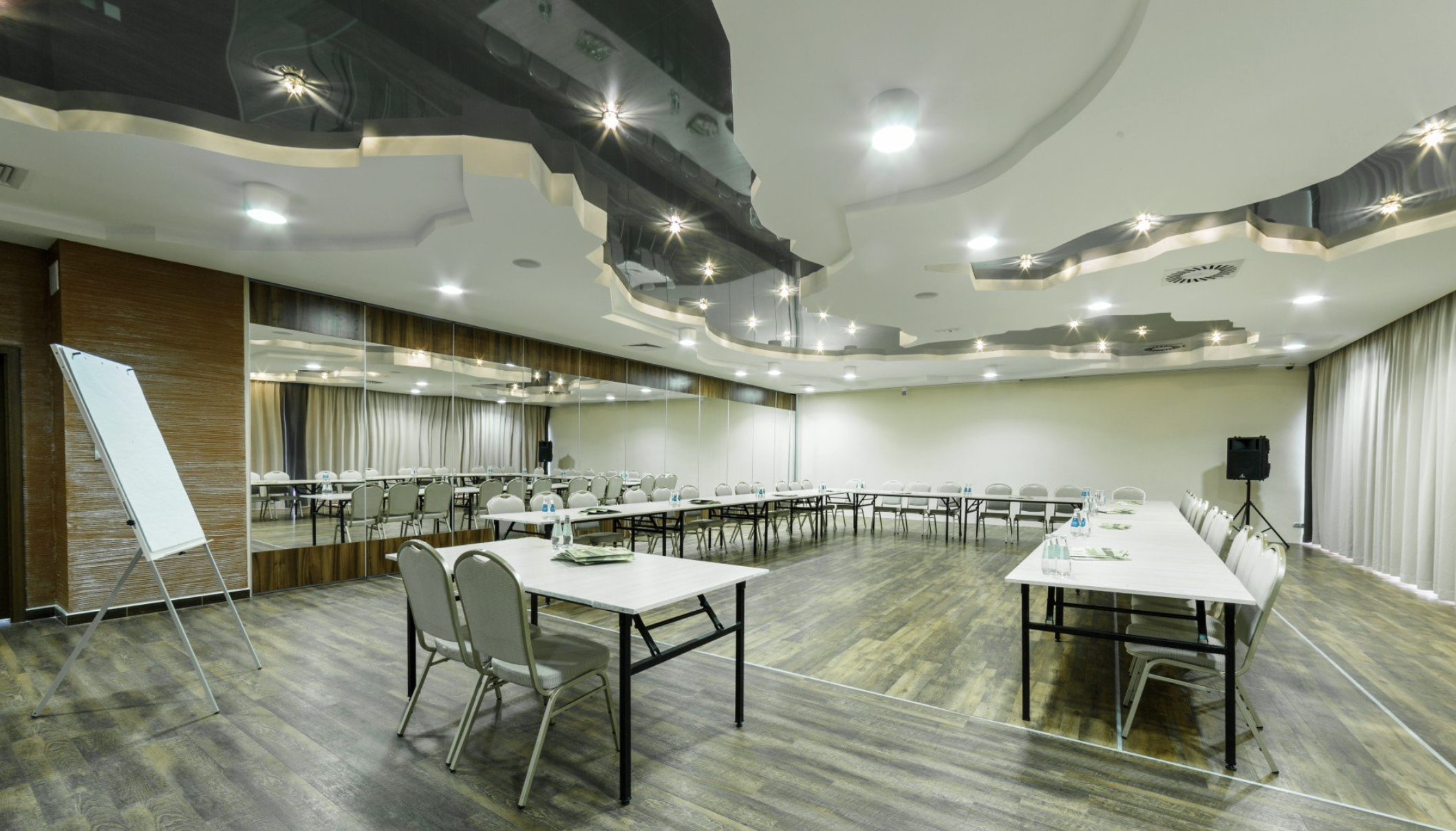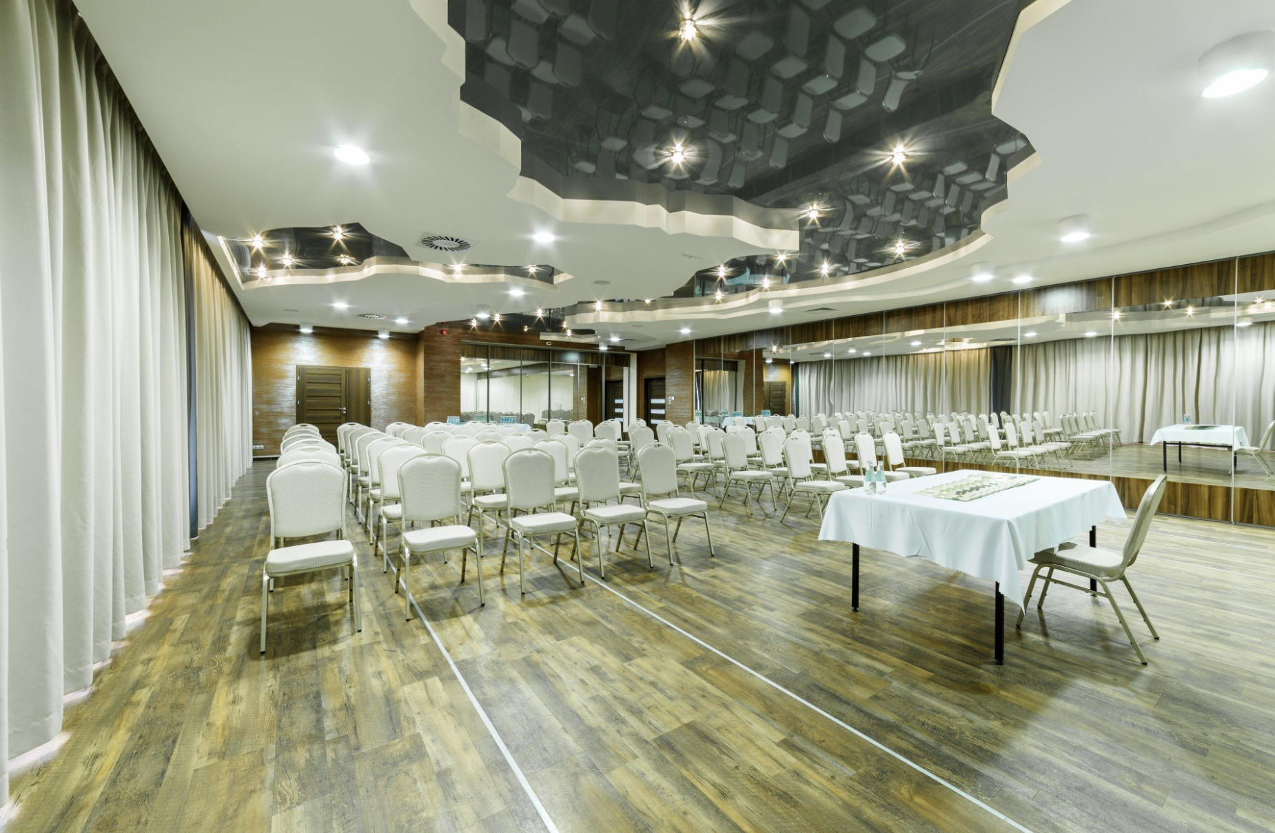 Duże okna zapewniają dostęp do naturalnego światła i widok na otoczenie, a klimatyzacja oraz nowoczesne oświetlenie gwarantują komfort pracy niezależnie od pory roku. Elastyczne ustawienia stołów, zarówno okrągłych, jak i prostokątnych, pozwalają dopasować przestrzeń do charakteru wydarzenia. Sale doskonale sprawdzają się także podczas bankietów, gal czy imprez tanecznych, dzięki parkietowi i profesjonalnemu nagłośnieniu.