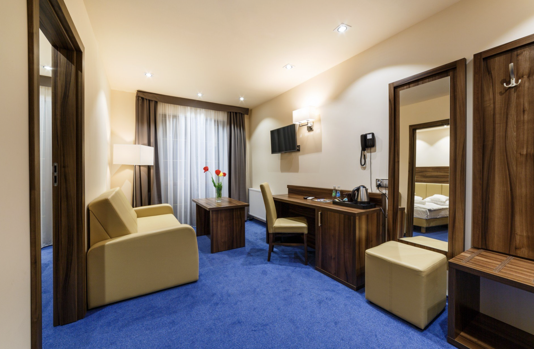 Jasne, funkcjonalne wnętrza zapewniają komfortowy wypoczynek po intensywnym dniu spotkań. Każdy pokój wyposażony jest w bezpłatny internet, miejsce do pracy, telewizor, zestaw do parzenia kawy i herbaty oraz prywatną łazienkę. Część pokoi posiada klimatyzację, a możliwość dostawki pozwala elastycznie dopasować zakwaterowanie do potrzeb grupy.