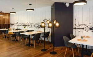 Na parterze w budynku głównym znajduje się Kawiarnia Pod Żaglami urządzona w stylu marynistycznym, która serwuje wysokiej jakości kawę, herbatę, przekąski, desery oraz piwo rzemieślnicze.