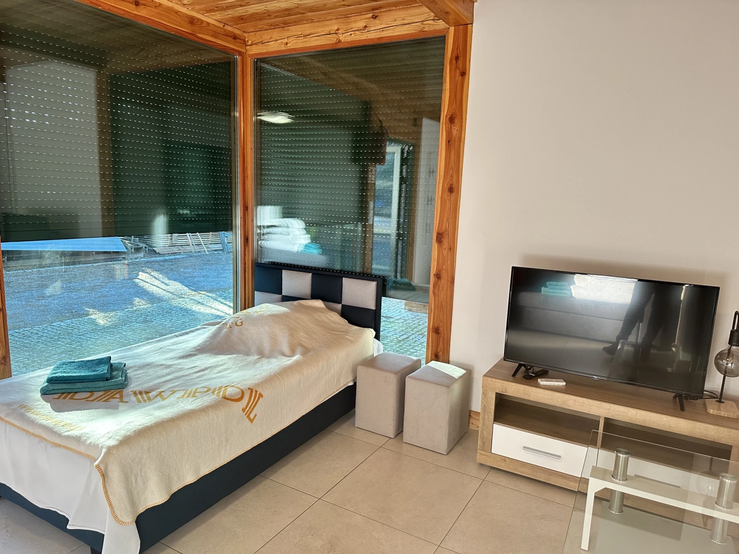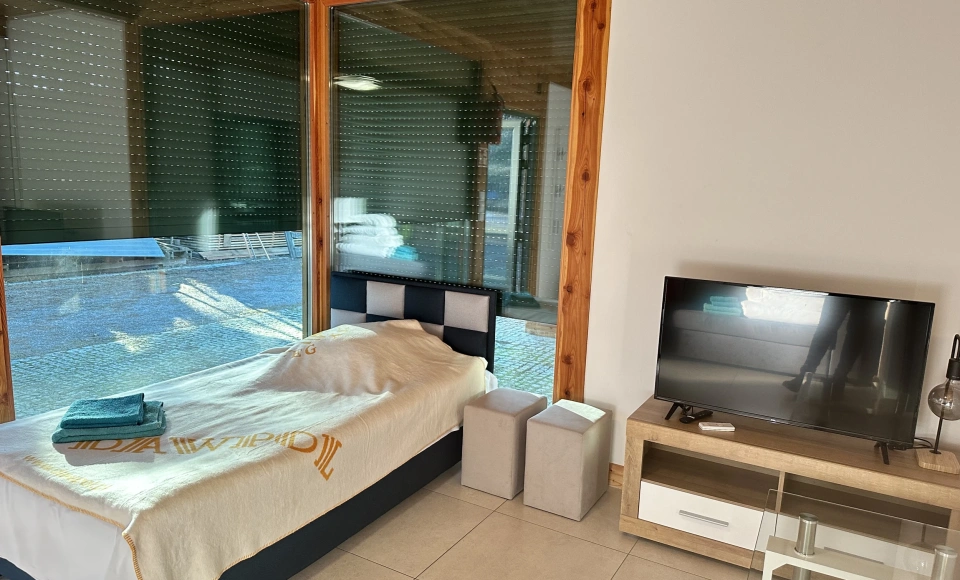 W cieplejsze dni goście mogą odpocząć w strefie basenowej, obejmującej dwa baseny: mniejszy z podgrzewaną wodą oraz większy o wymiarach 10 × 5 metrów, zlokalizowany w pobliżu sauny. Przestrzeń wokół basenów sprzyja również organizacji aktywności integracyjnych, takich jak gry zespołowe, paintball czy zajęcia na strzelnicy, które urozmaicają pobyt grup zorganizowanych i wydarzeń firmowych.