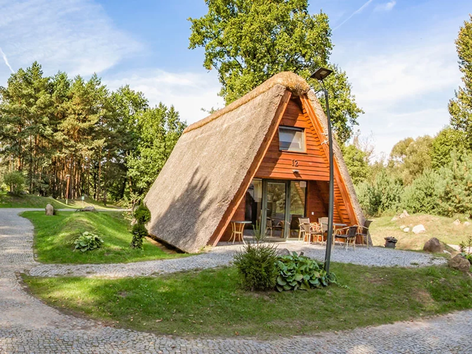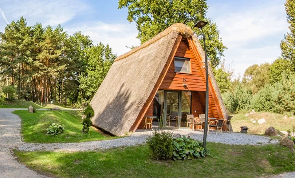 Na terenie ośrodka znajdują się klimatyczne domki kryte strzechą, położone wśród sosnowego lasu. To spokojna przestrzeń sprzyjająca wypoczynkowi, chętnie wybierana przez pary, rodziny z dziećmi, gości weselnych czy osoby przebywające w delegacji.