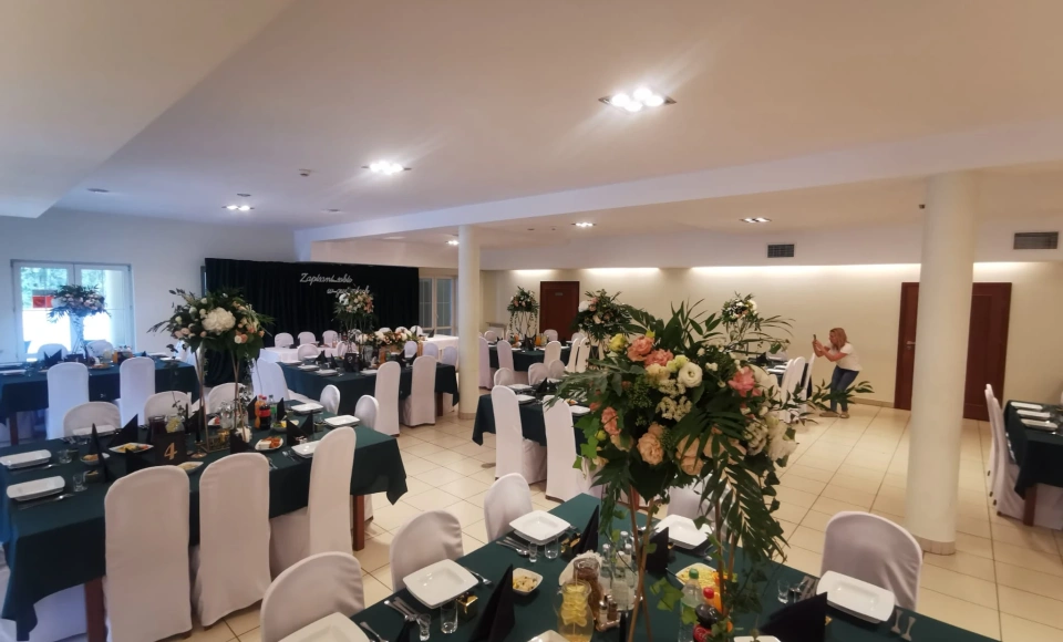 Sala bankietowa jest też dobrze wyposażona w klimatyzację i profesjonalny system nagłośnieniowy, który zapewnia długą zabawę na wielkim parkiecie.