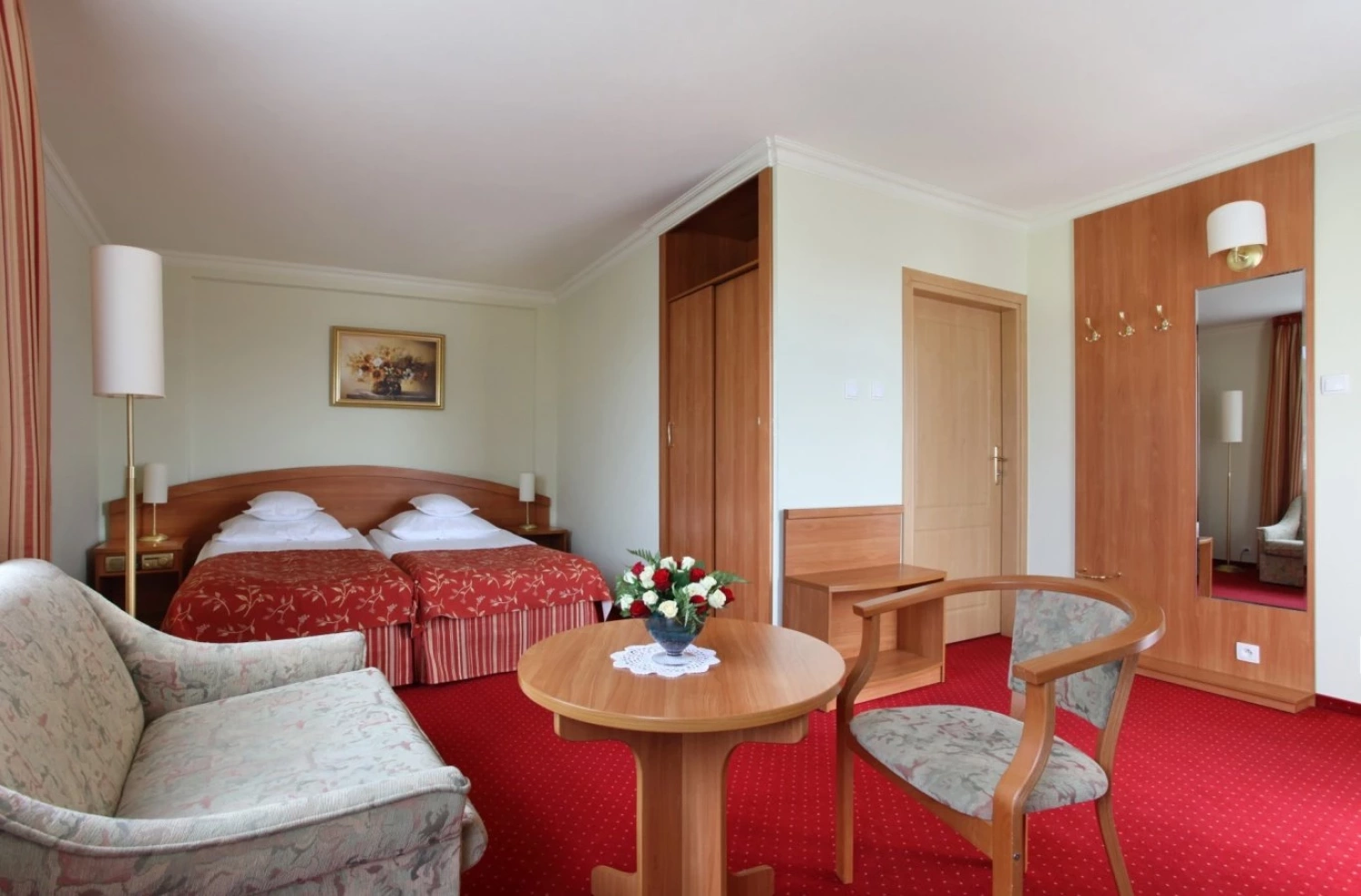 Na wyposażeniu pokoju jest również biurko, na którym można wygodnie pracować lub przeglądać dokumenty, a wykładzina podłogowa zapewni dodatkowy komfort podczas pobytu. W szafie każdy znajdzie miejsce na swoje rzeczy, a zestaw do parzenia kawy lub herbaty pozwoli na przygotowanie ciepłego napoju o dowolnej porze dnia.