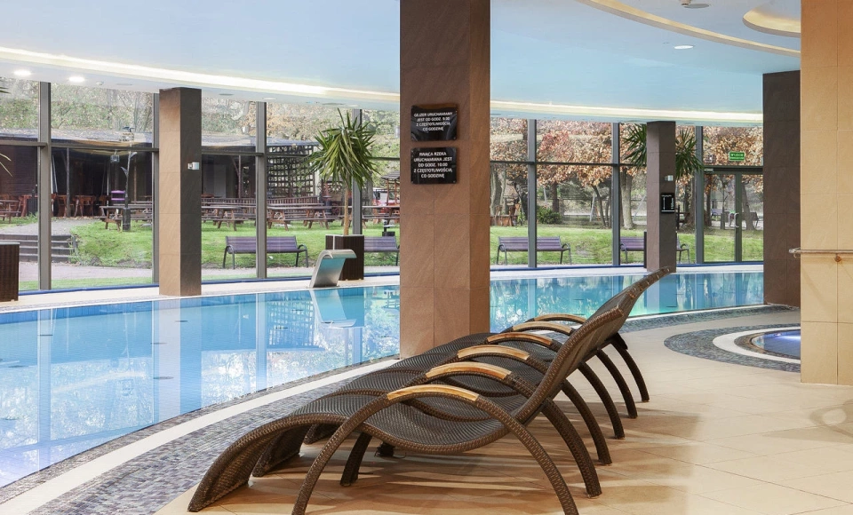 - Parku Wodnego o powierzchni 1000 m2 z 3 basenami, jacuzzi, przeciwprądem