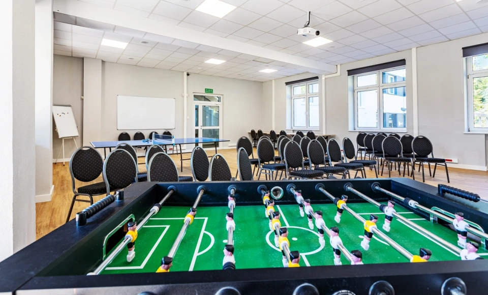 Oferta konferencyjno-szkoleniowa obejmuje zakwaterowanie w pokojach z pełnym wyposażeniem, codzienne śniadania i obiadokolacje serwowane w formie bufetu, a także dostęp do udogodnień rekreacyjnych. Goście mogą korzystać z sauny suchej, sali gier z bilardem, ping-pongiem i piłkarzykami, a także z bezpłatnego parkingu na terenie resortu.