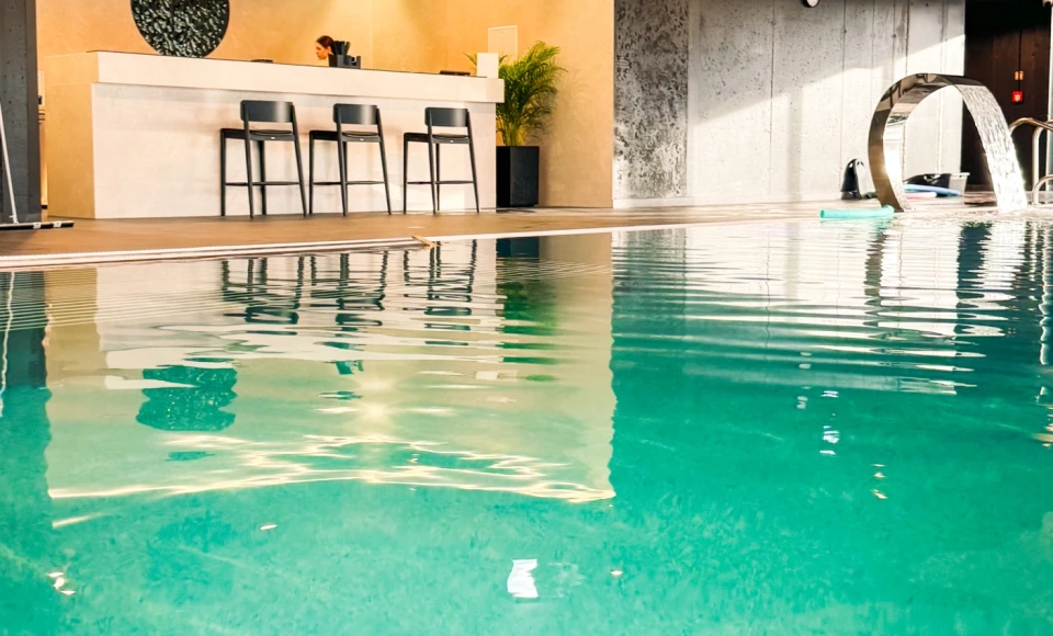 * Wewnętrzny basen główny, który przechodzi bezpośrednio w całoroczny basen zewnętrzny z przeciwprądami, kaskadami wodnym, hydromasażami oraz podwodnymi siedziskami i wodospadami.