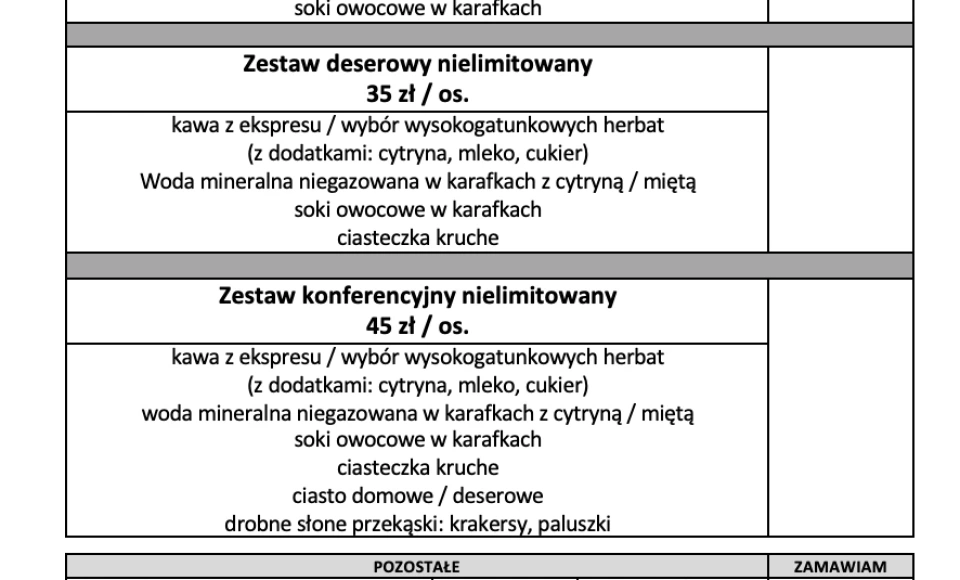 szczególnie polecamy ZESTAW KONFERENCYJNY nielimitowany: kawa z ekspresu, wybór wysokogatunkowych herbat, woda niegazowana w karafkach z miętą/cytryną, soki w karafkach, ciasteczka kruche, ciasto domowe / deserowe, drobne słone przekąski (krakersy, paluszki) - 45 zł / os.