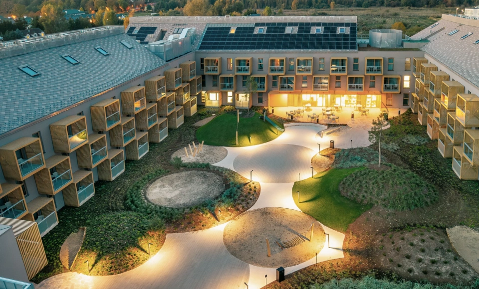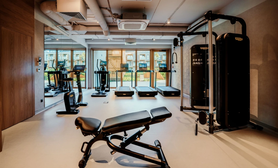 Goście mogą korzystać z siłowni, tarasów do jogi i medytacji, tras rowerowych oraz ścieżek do Nordic Walking. Dla rodzin przygotowano zewnętrzny plac zabaw. Na terenie obiektu działa także lobby bar i strefa wellness.