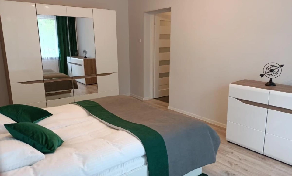 Każde z pomieszczeń wyposażone jest w wygodne łóżka i miejsce do pracy.