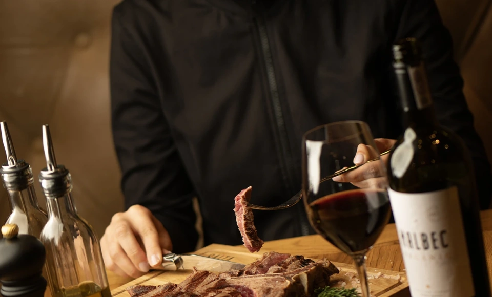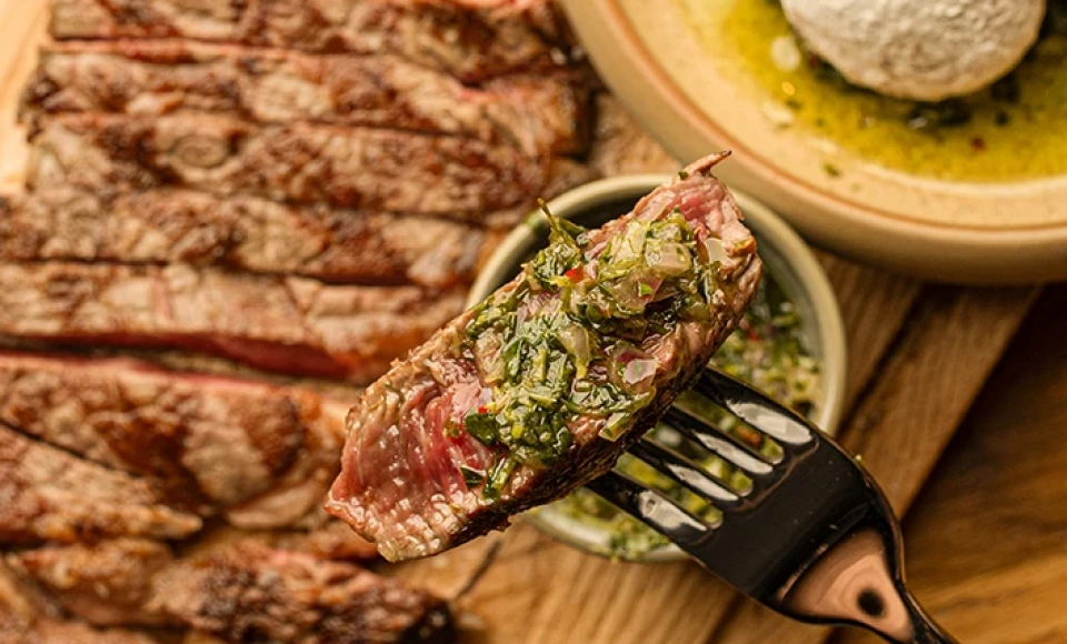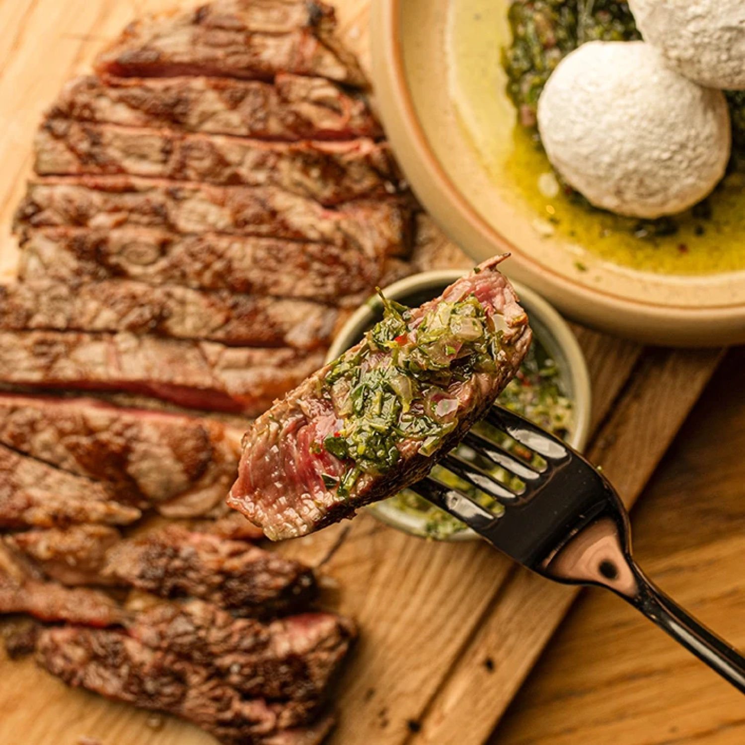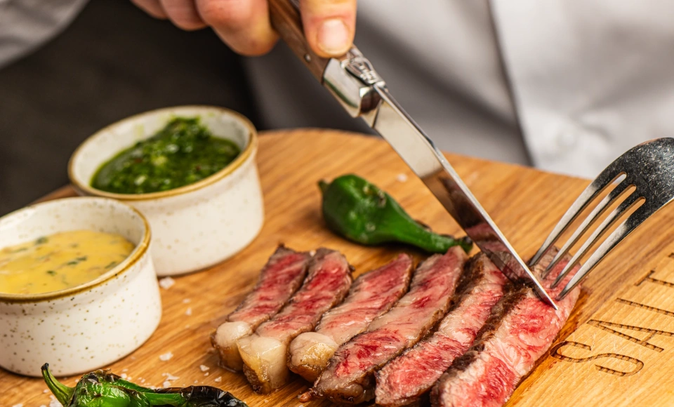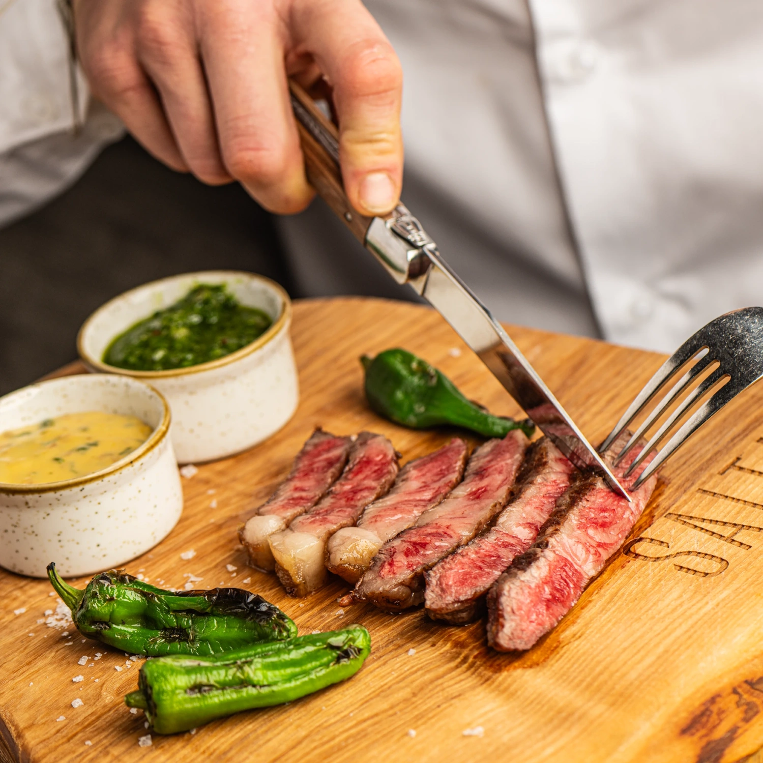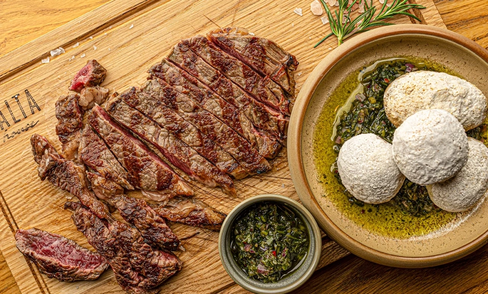 Menu łączy argentyńską tradycję steak house’u z lekkimi, wyrazistymi akcentami kuchni peruwiańskiej. Obok perfekcyjnie przygotowanych steków pojawiają się dania w formule sharingowej, w tym ceviche, które wprowadza świeżość i kontrast smaków.