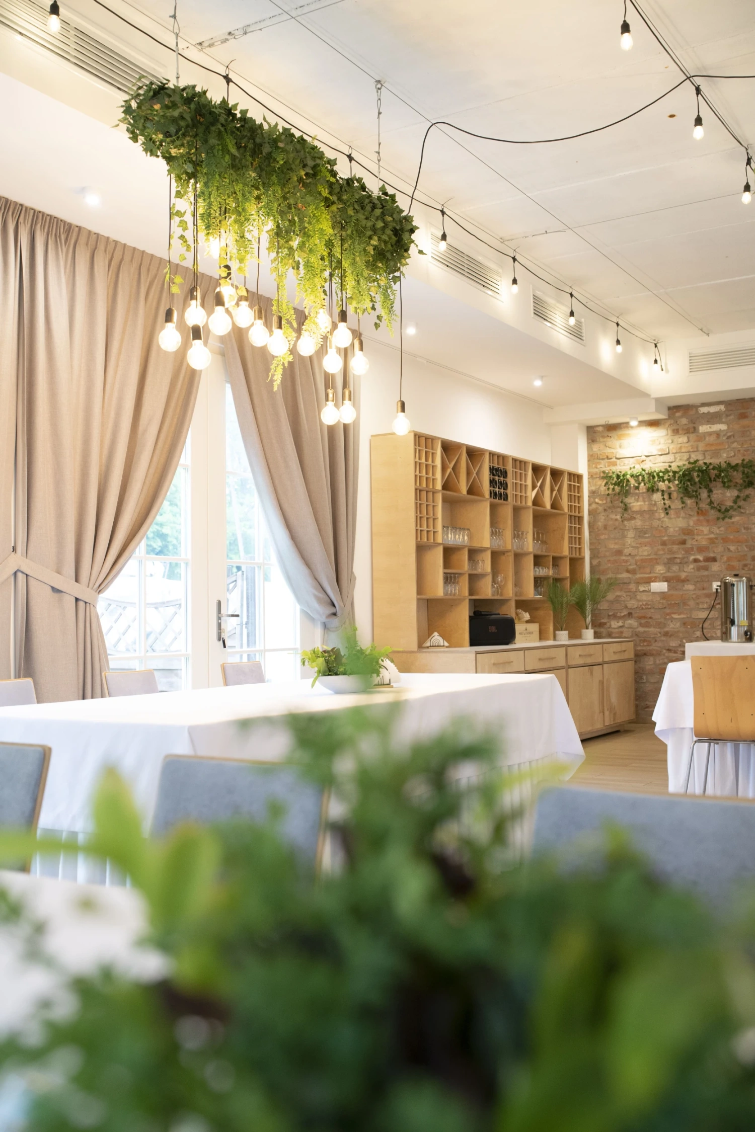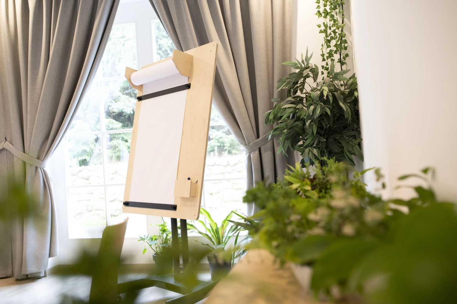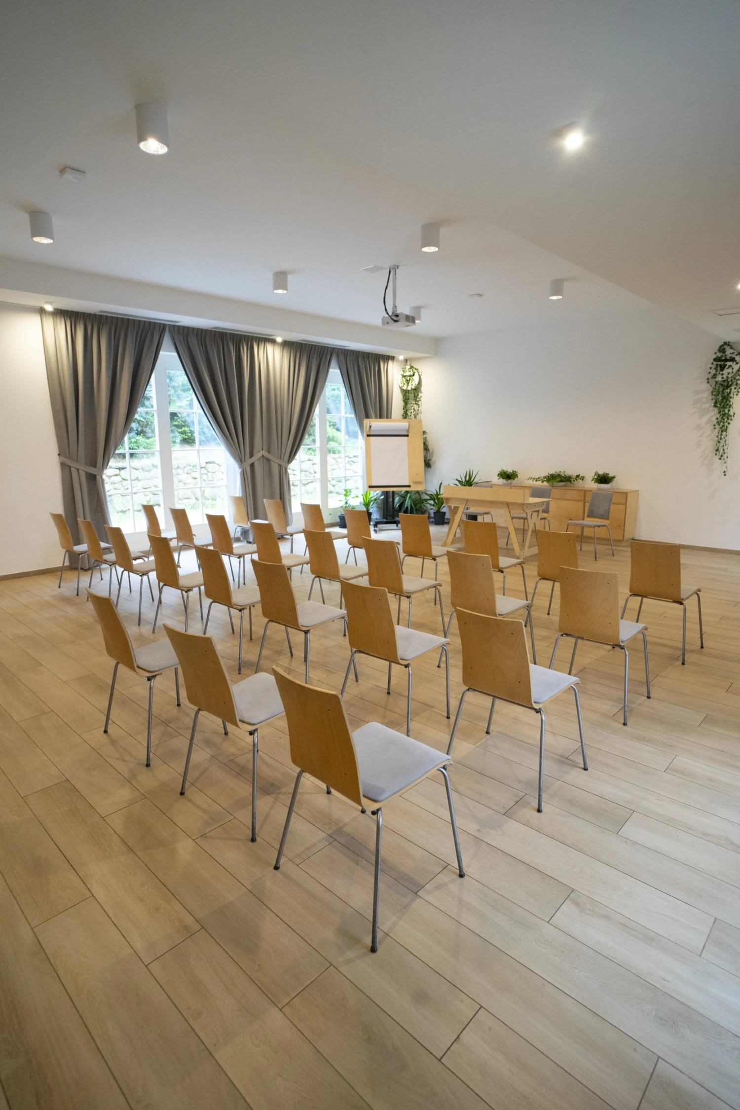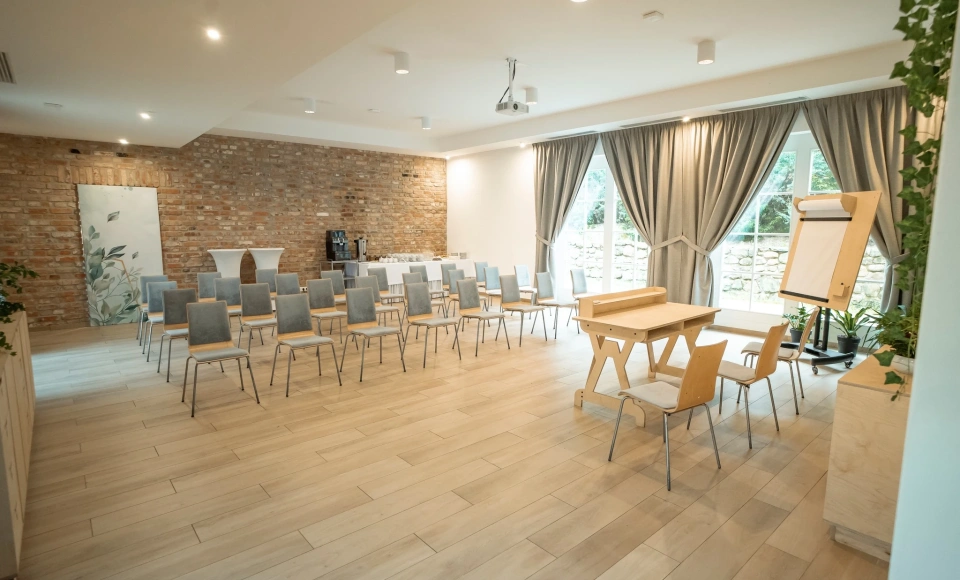 Z kolei sala konferencyjna została zaprojektowana z myślą o biznesie i pracy twórczej. Neutralna estetyka, nowoczesne wyposażenie techniczne – w tym rzutnik, ekran i nagłośnienie – oraz możliwość zaciemnienia wnętrza zapewniają komfort prowadzenia zarówno kameralnych szkoleń, jak i większych spotkań firmowych. Duże okna wypełniają przestrzeń światłem dziennym, sprzyjając koncentracji i kreatywności.