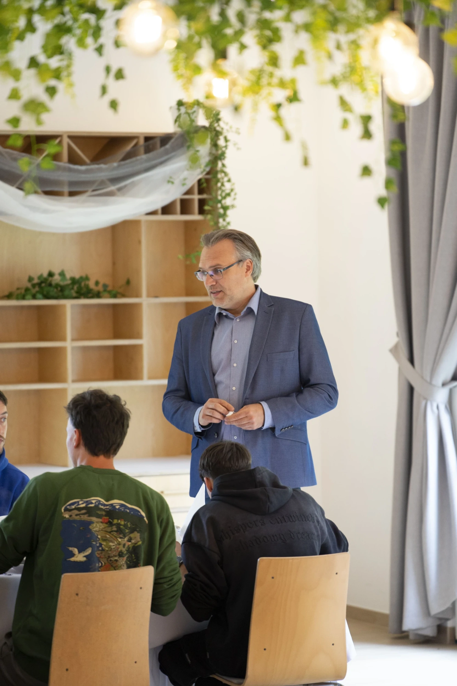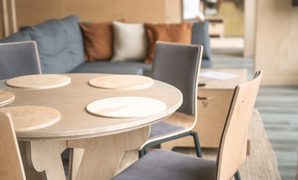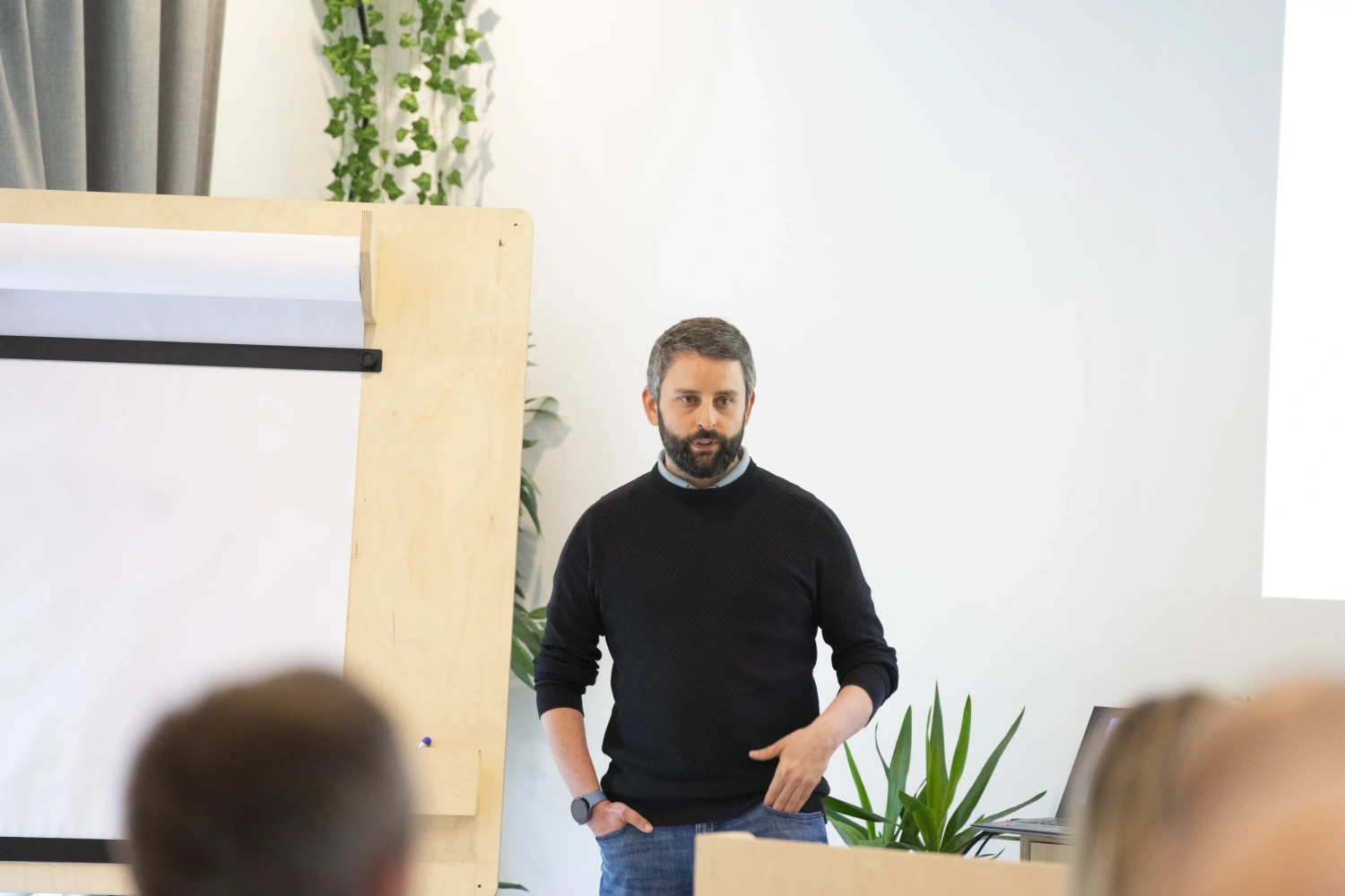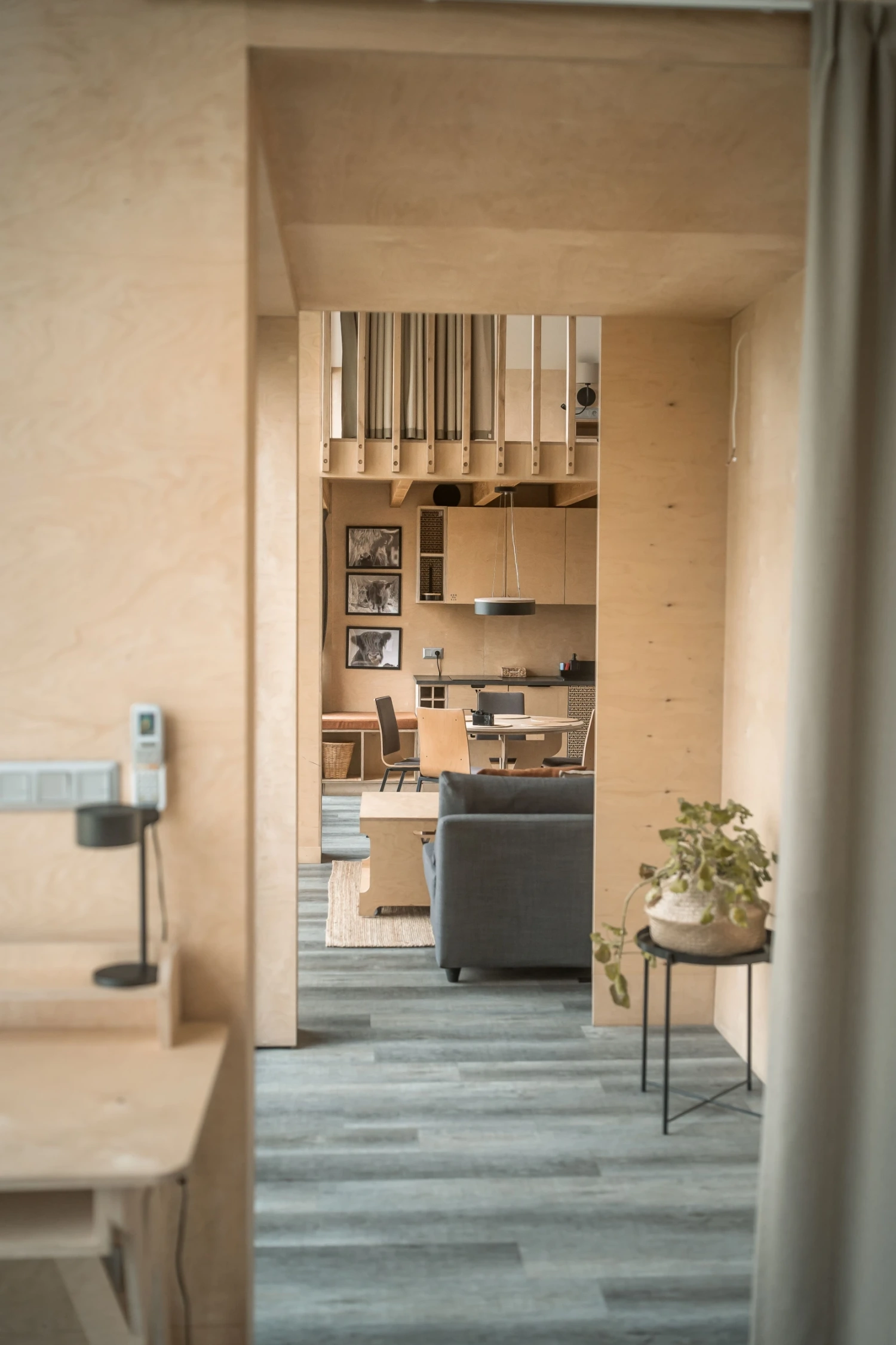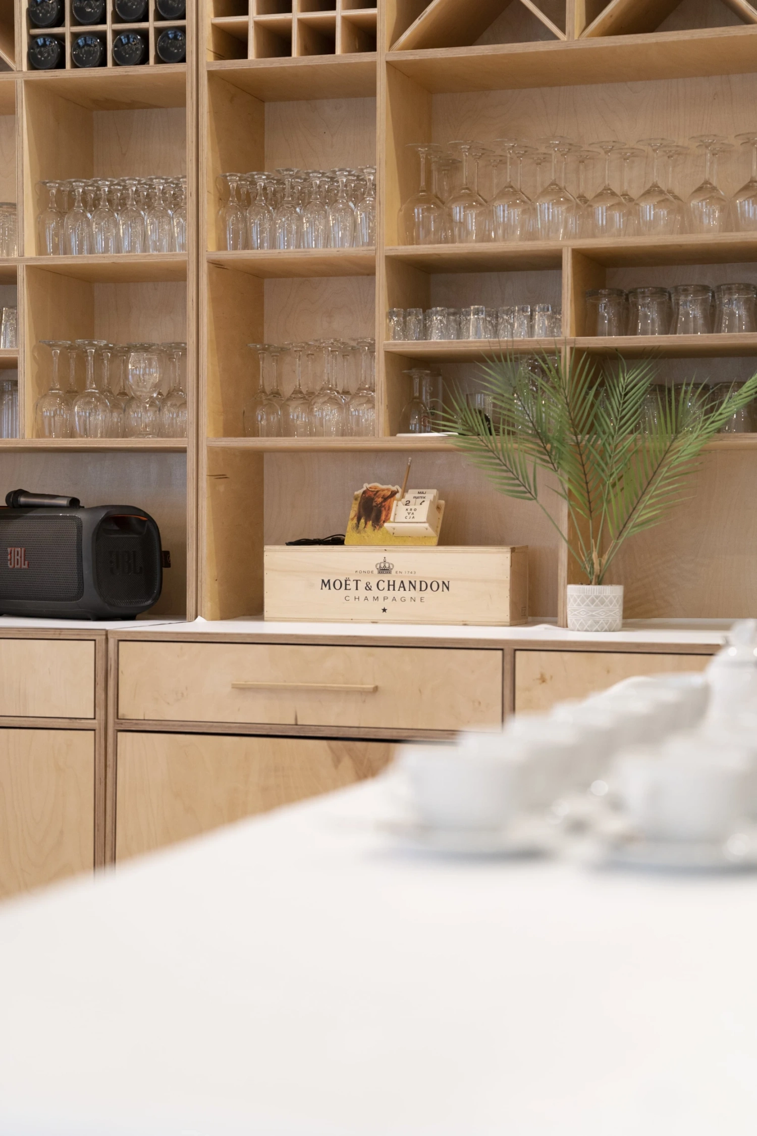Z kolei sala konferencyjna została zaprojektowana z myślą o biznesie i pracy twórczej. Neutralna estetyka, nowoczesne wyposażenie techniczne – w tym rzutnik, ekran i nagłośnienie – oraz możliwość zaciemnienia wnętrza zapewniają komfort prowadzenia zarówno kameralnych szkoleń, jak i większych spotkań firmowych. Duże okna wypełniają przestrzeń światłem dziennym, sprzyjając koncentracji i kreatywności.