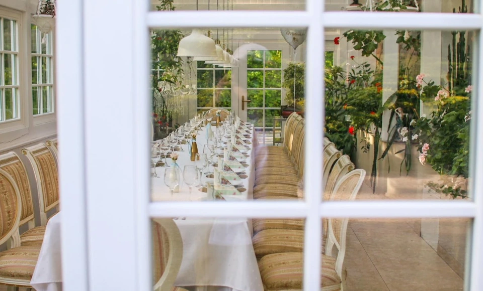 Oranżeria to przeszklona sala z widokiem na 500-letnią lipę - naturalny pomnik przyrody, który tworzy niepowtarzalne tło dla spotkań.