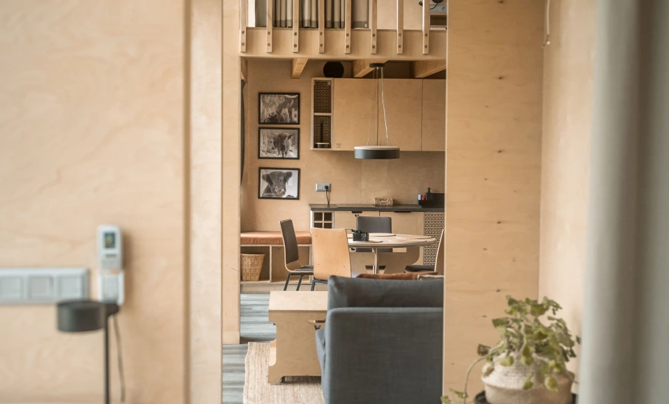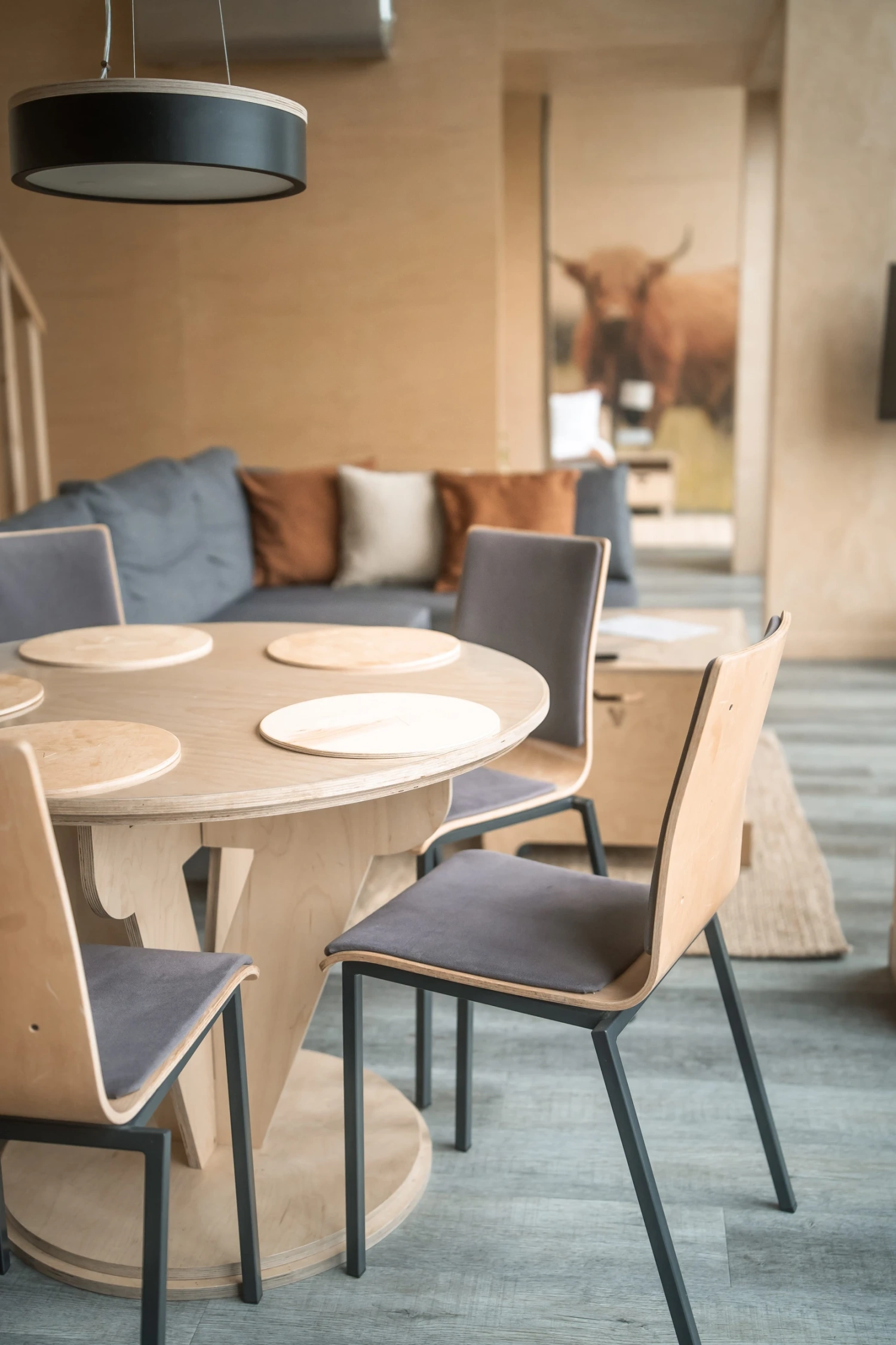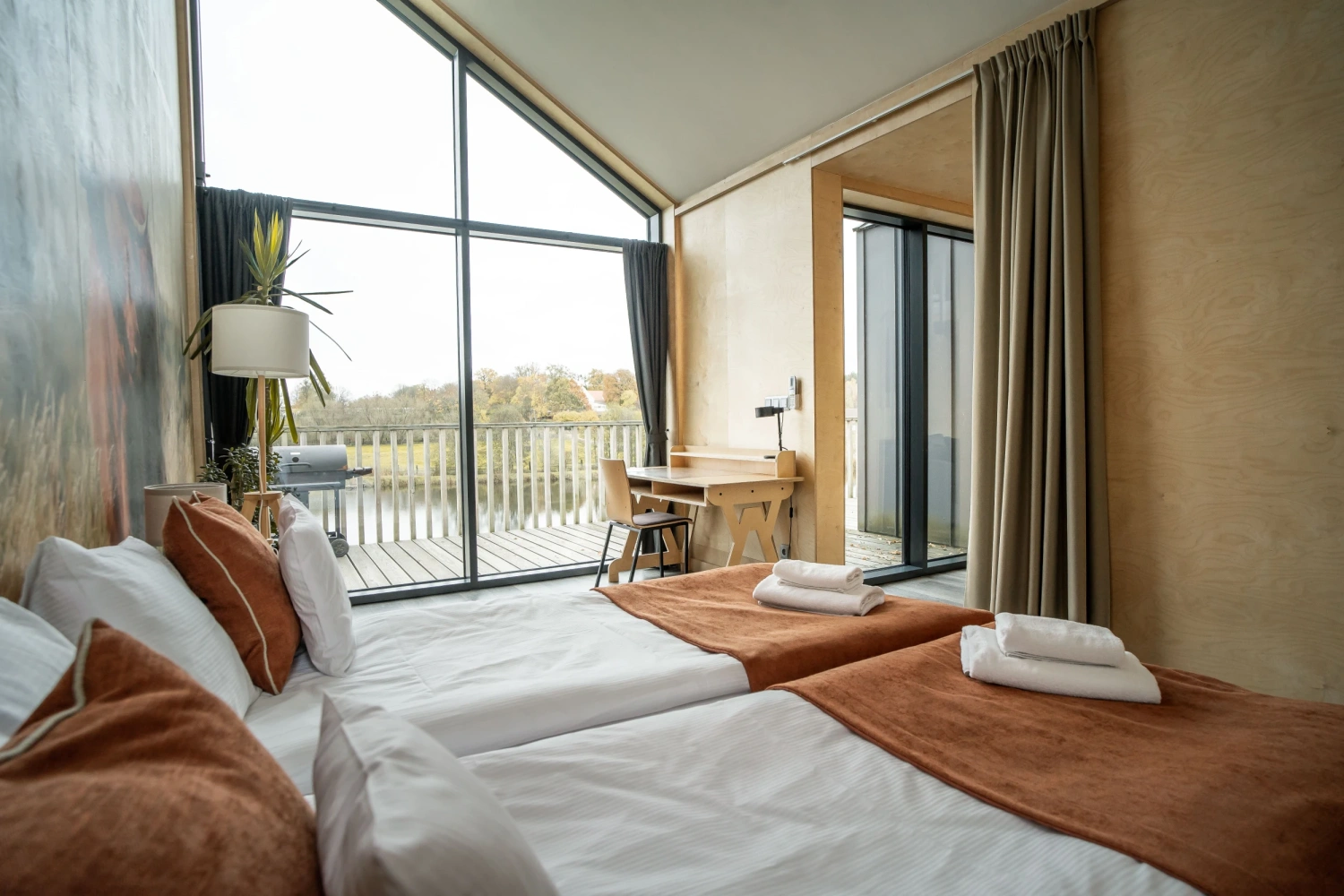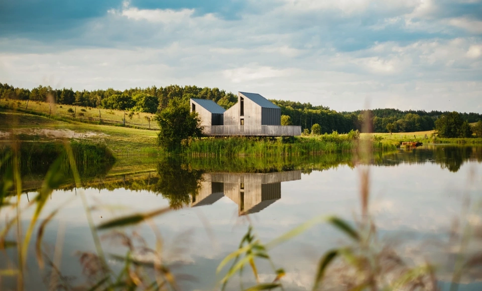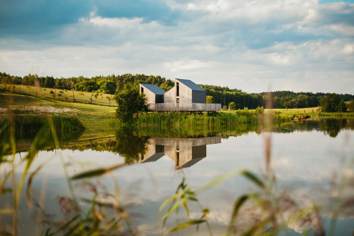 Alternatywą są Domki Krovacja, które łączą współczesny design z bliskością natury. Jasne, funkcjonalne wnętrza otwierają się na panoramiczne widoki stawów i pastwisk, gdzie pasą się szkockie krowy Highland. Prywatne tarasy umożliwiają relaks na świeżym powietrzu i tworzą idealne warunki do spędzania czasu w ciszy i spokoju.