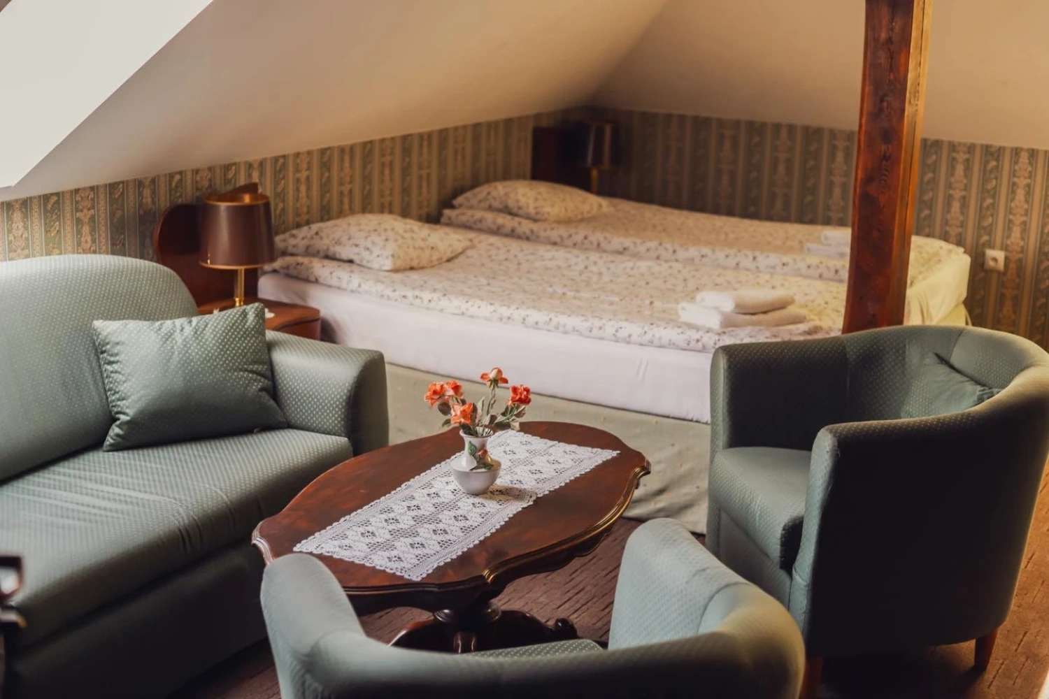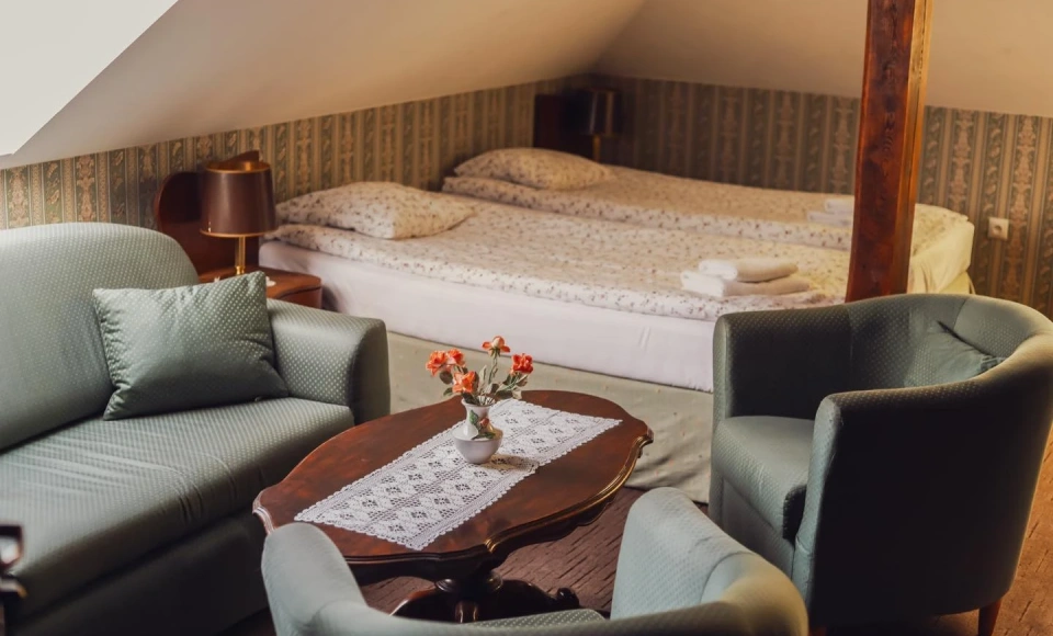 W samym Dworze goście mogą zatrzymać się w nastrojowych pokojach, urządzonych z poszanowaniem tradycji i dbałością o detale. Stylowe meble z naturalnego drewna, subtelne akcenty dekoracyjne oraz ciepła kolorystyka tworzą atmosferę sprzyjającą odpoczynkowi i refleksji.