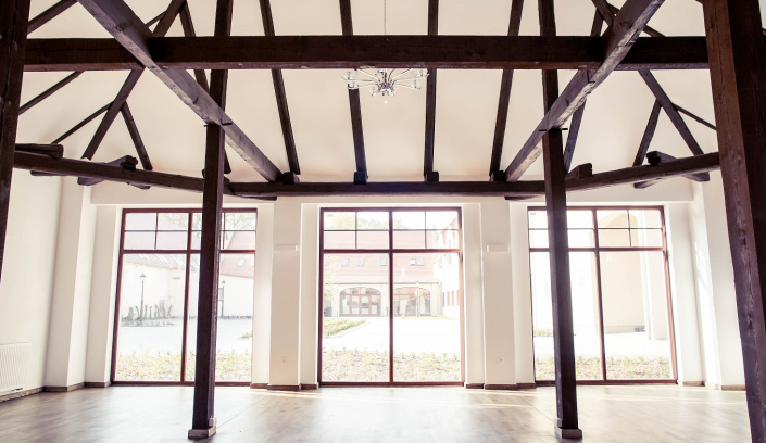 Klimatyzowana Sala Platynowa to znakomite połączenie tradycji z nowoczesnością. Dzięki systemowi mobilnych ścian salę można podzielić na dwa mniejsze pomieszczenia.