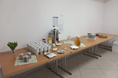 Podstawowy serwis kawowy to: kawa, herbata, woda, soki, ciasteczka kruche.