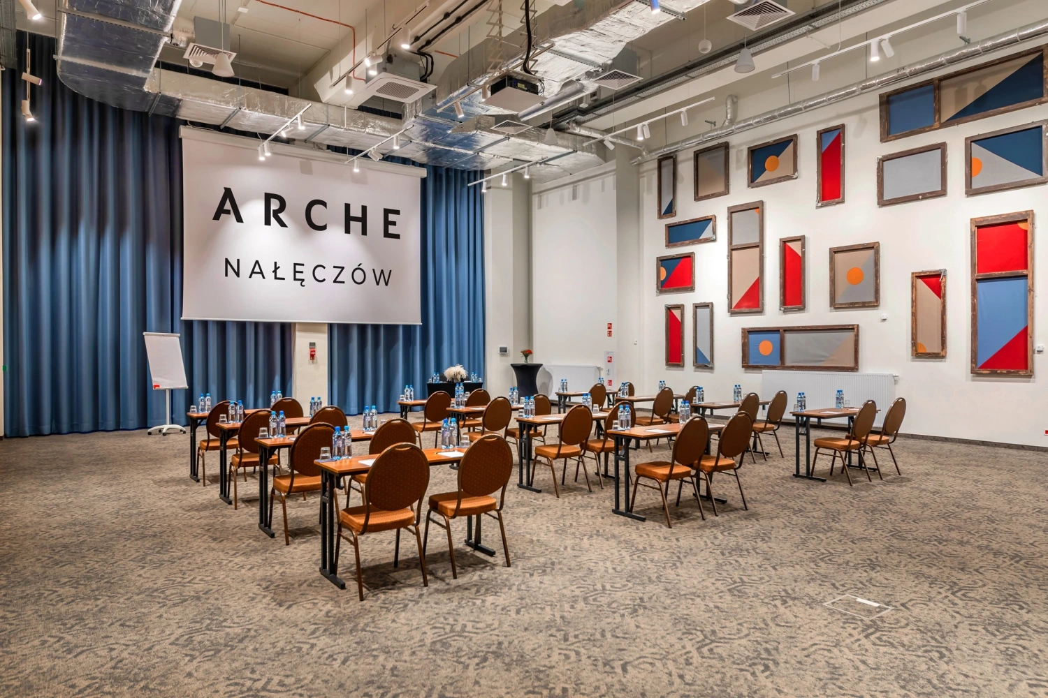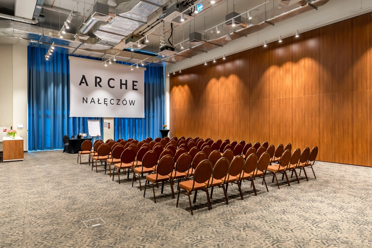 Arche Nałęczów oferuje 9 sal konferencyjnych, dostosowanych do różnorodnych eventów biznesowych. Sala Harmonii (600 m², 5,5 m wysokości) z dostępem do światła dziennego jest idealna na duże wydarzenia. Sala Uzdrowienia (160 m²) i Sale Witalności oraz Regeneracji (44 m² każda) mogą być dzielone, co umożliwia elastyczne aranżacje. Obiekt zapewnia przestrzeń zarówno na kameralne warsztaty, jak i duże konferencje.