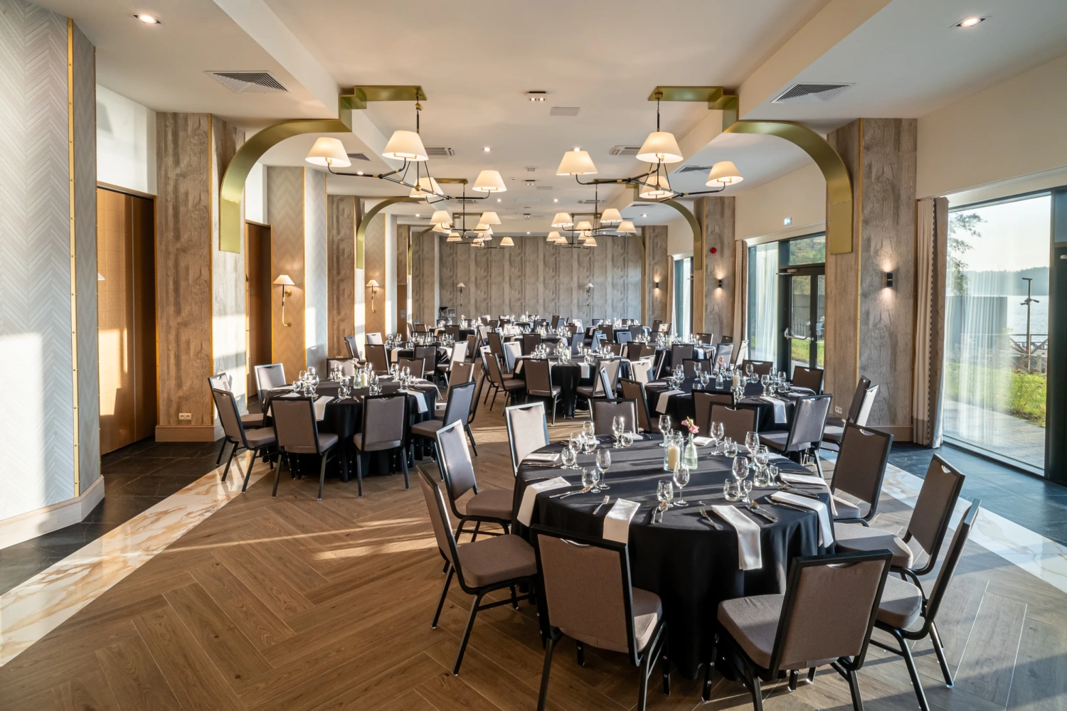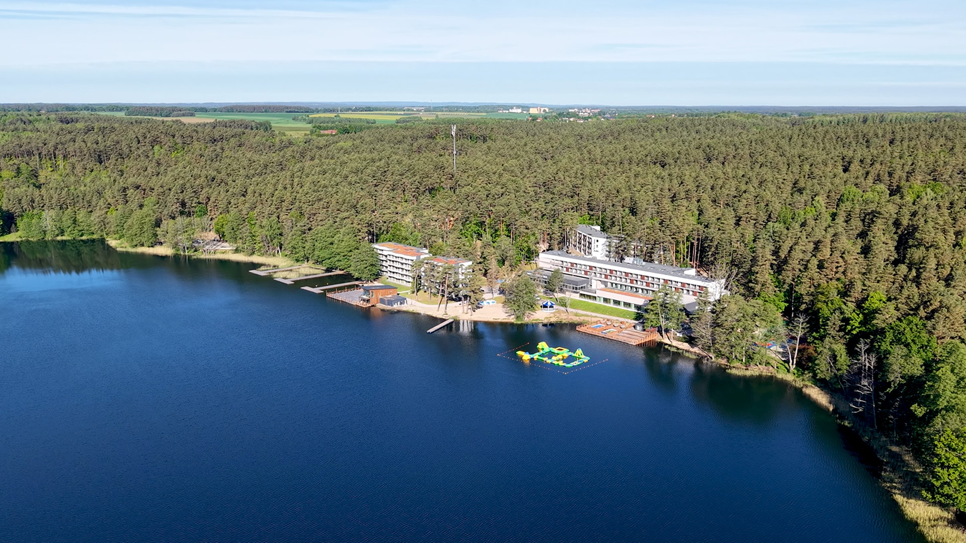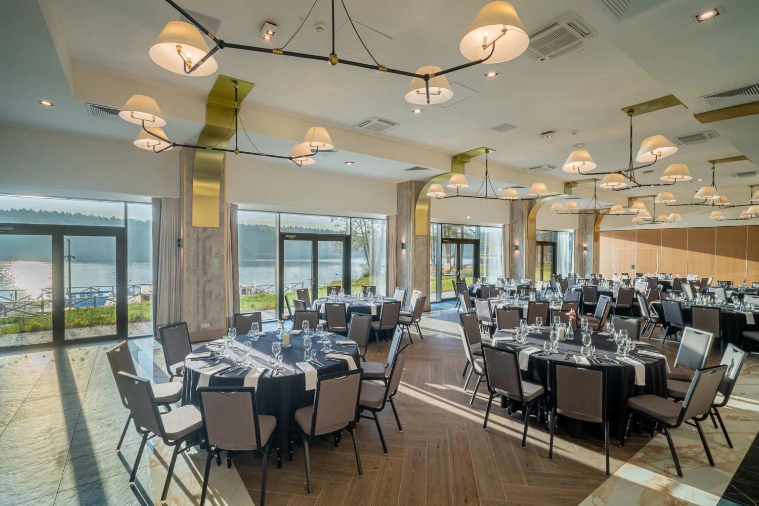Na pierwszym piętrze usytuowana jest Restauracja Panorama, która, poza swoją codzienną funkcją, doskonale sprawdza się jako przestrzeń eventowa. Sala o powierzchni 340 metrów kwadratowych wyróżnia się niepowtarzalnym atutem: panoramicznym widokiem na jezioro Pluszne i otaczający je las, co nadaje każdemu wydarzeniu wyjątkowego charakteru.