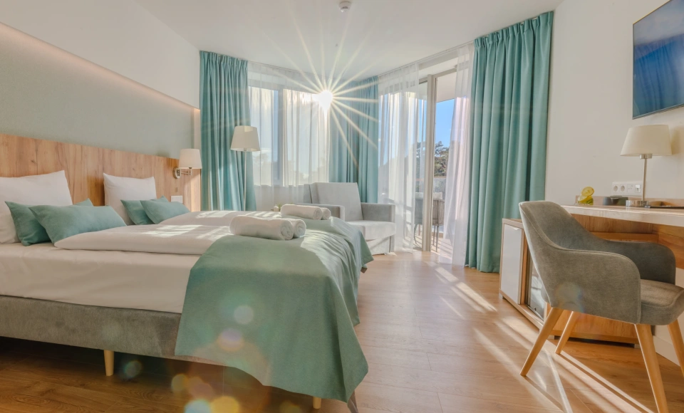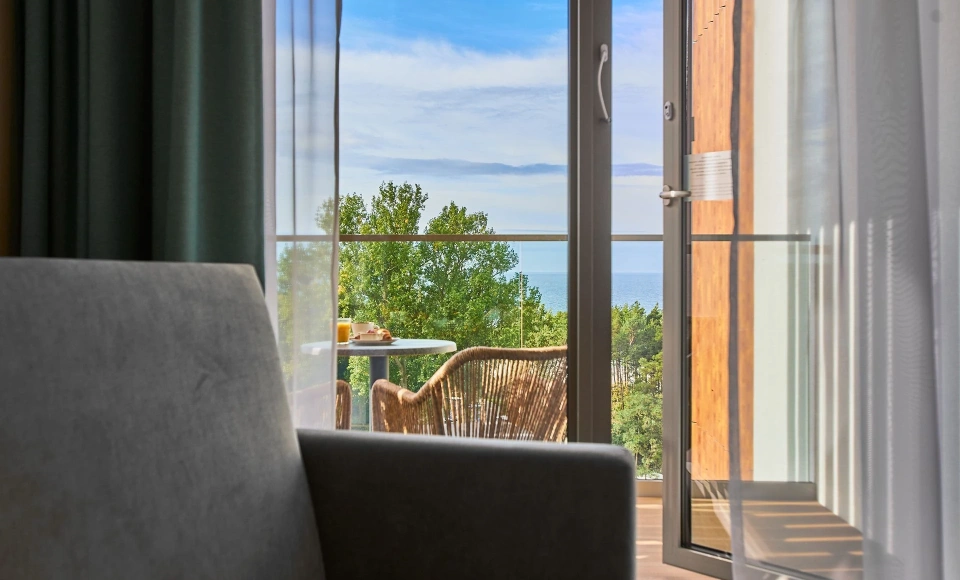 Tak, resort posiada rozbudowaną strefę wodno-relaksacyjną. Goście mogą korzystać z basenu pływackiego o głębokości 2 metrów, basenu rekreacyjnego z widokiem na nadmorską zieleń, brodzika dla dzieci, jacuzzi oraz zestawu saun i łaźni (fińska, parowa, aromatyczna). Dodatkowo strefa wypoczynku z grotą solną i leżakami zapewnia przestrzeń do pełnego relaksu i regeneracji.