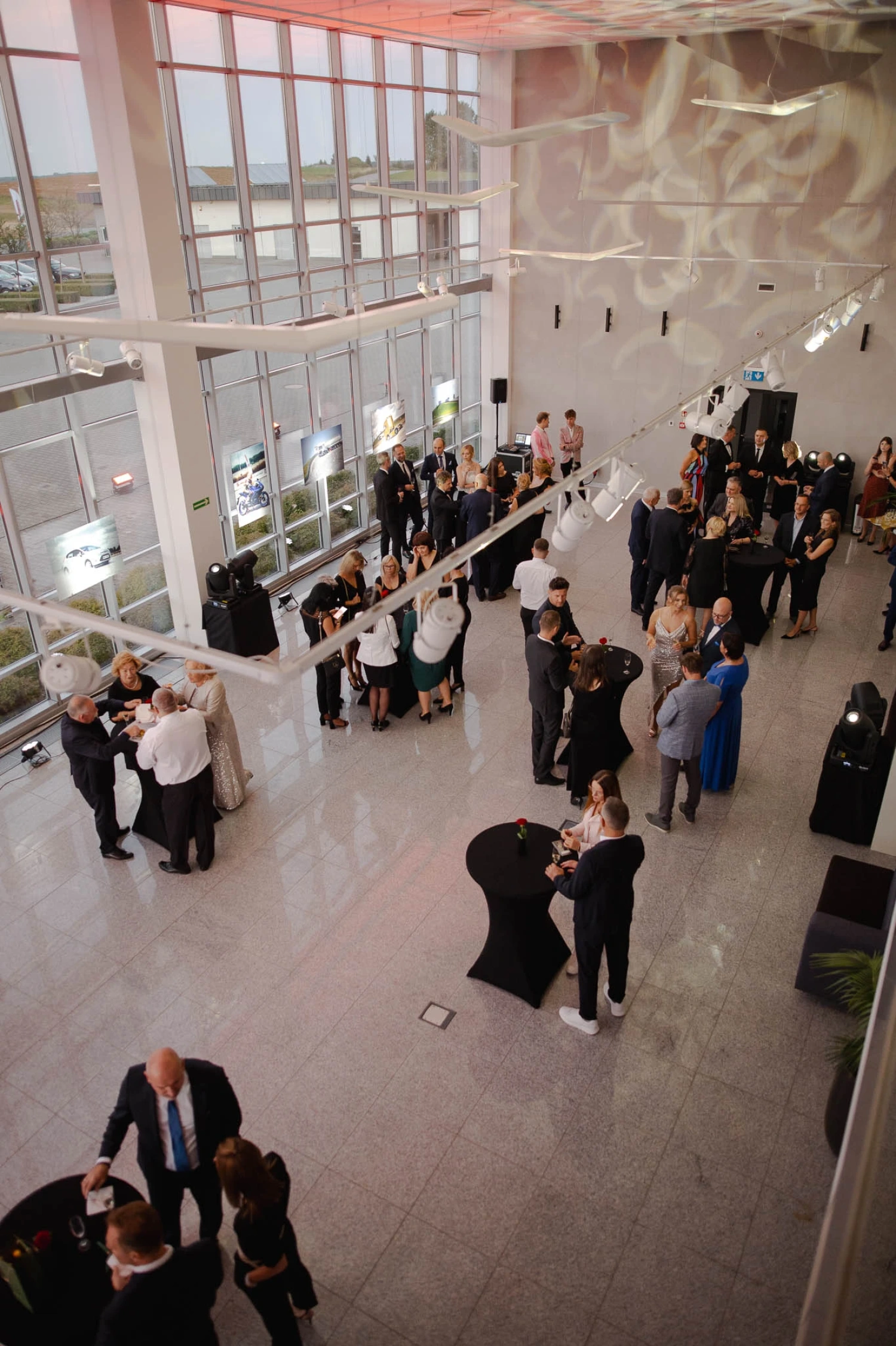 Wejście do obiektu prowadzi przez imponujące lobby otoczone szkłem. To idealna przestrzeń do powitań, rejestracji uczestników, a także jako tło dla prezentacji produktów czy koktajlu inauguracyjnego.