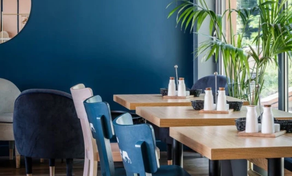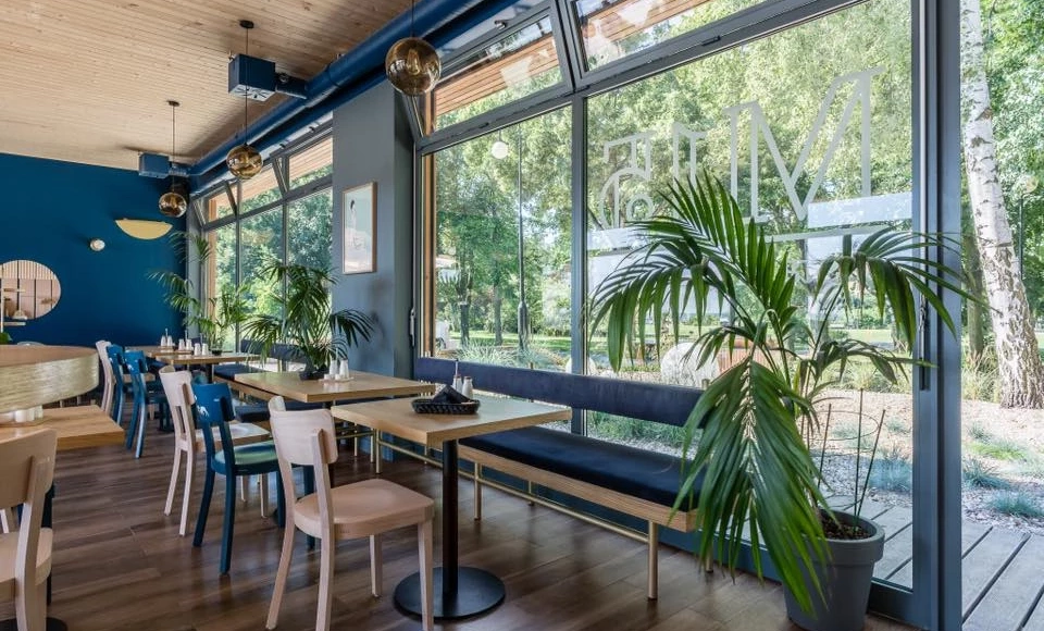 Restauracja M15 Sopot to idealne, świetnie wyposażone miejsce na organizację wszelkiego typu eventów zarówno biznesowych, jak i okolicznościowych. Wnętrza obiektu przypadną do gustu fanom nowoczesności i geometrycznych wykończeń. Królują tu szerokie pasy w dwóch kolorach: głębokiego granatu i jasnego pudru. Poszczególne elementy wnętrza podporządkowane są tym dwóm kolorom, a mosiężne elementy dodają restauracji wyjątkowego charakteru. Meble i dodatki budują klimat tego miejsca. Nic nie jest tu przypadkowe - welurowa ława, podwieszane półki, duży stół barowy i charakterystyczny regał, który oddziela jadalnie od kawowej części z pufami i kanapami.
