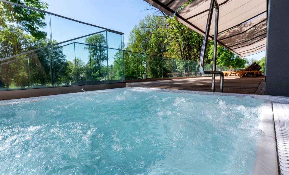 Dysponujemy strefą Wellness - basen, sauna sucha, sauna mokra, jacuzzi zewnętrze i wewnętrzne, siłownia.