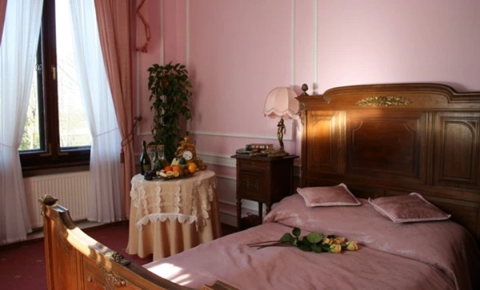 Kompleks hotelowy (Bursztynowy Pałac, Biały Pałac, Rezydencja Myśliwska) posiada 62 pokoje dwuosobowe oraz 5 apartamentów -królewski oraz 4 apartamenty książęce - 150 miejsc noclegowych. Luksusowe pokoje mają widok na imponujący ogród, część na otaczający las, skąd czasami słychać pohukiwanie sowy. Każdy pokój jest inny, wyjątkowy, na miłośników antyków czekają pokoje stylowe, wyposażone w oryginalne zabytkowe meble oraz artykuły dekoracyjne i stylizowane bibeloty.