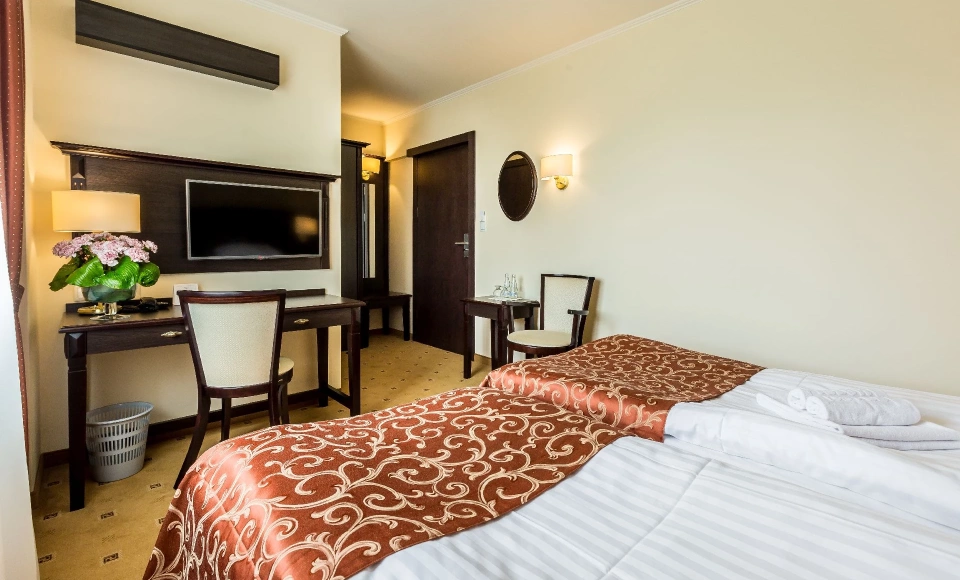 Pokoje w Hotelu Krzyskim urządzone są elegancko i z klasą w klasycznym stylu. Ciepłe barwy, ciemne meble oraz wystawne i ciężkie zasłony sprawiają, że pomieszczenia są przytulne i mają wyjątkowy klimat.