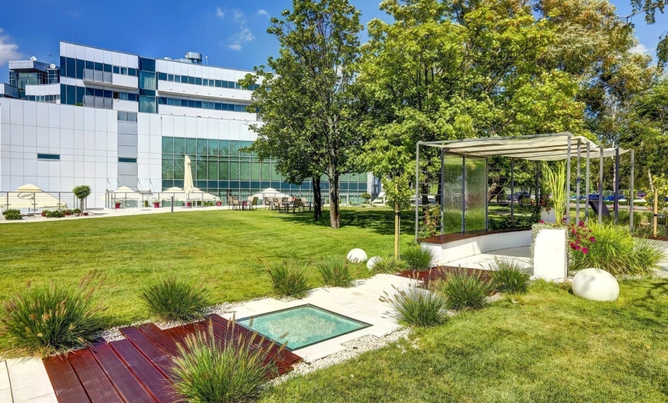 co daje dużo możliwości na wypoczynek na świeżym powietrzu oraz odprężenie gości. Dodatkowo, otaczający hotel teren zielony wpływa pozytywnie na pracę umysłową i skupienie.