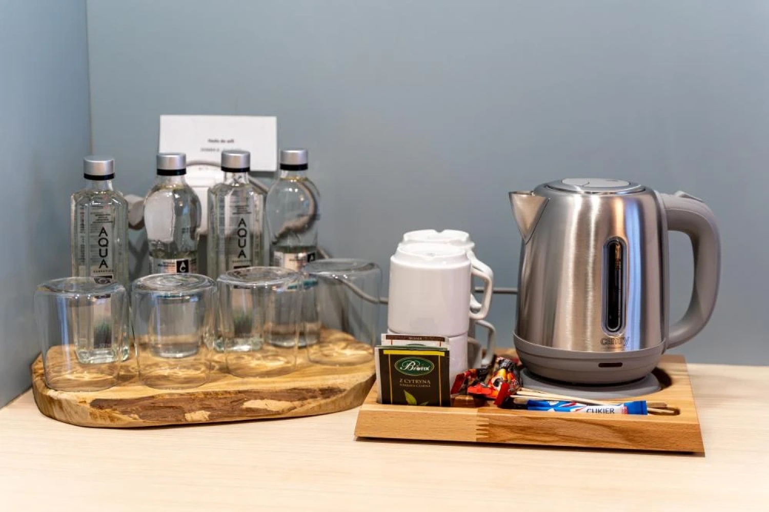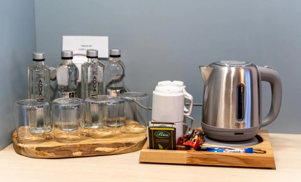Goście mogą korzystać także z praktycznego wyposażenia, takiego jak czajnik elektryczny, komplet naczyń, ręczniki, kosmetyki hotelowe czy radioodbiornik. Z myślą o nadmorskim charakterze obiektu w pokojach dostępny jest również sprzęt plażowy, obejmujący leżak i parawan.