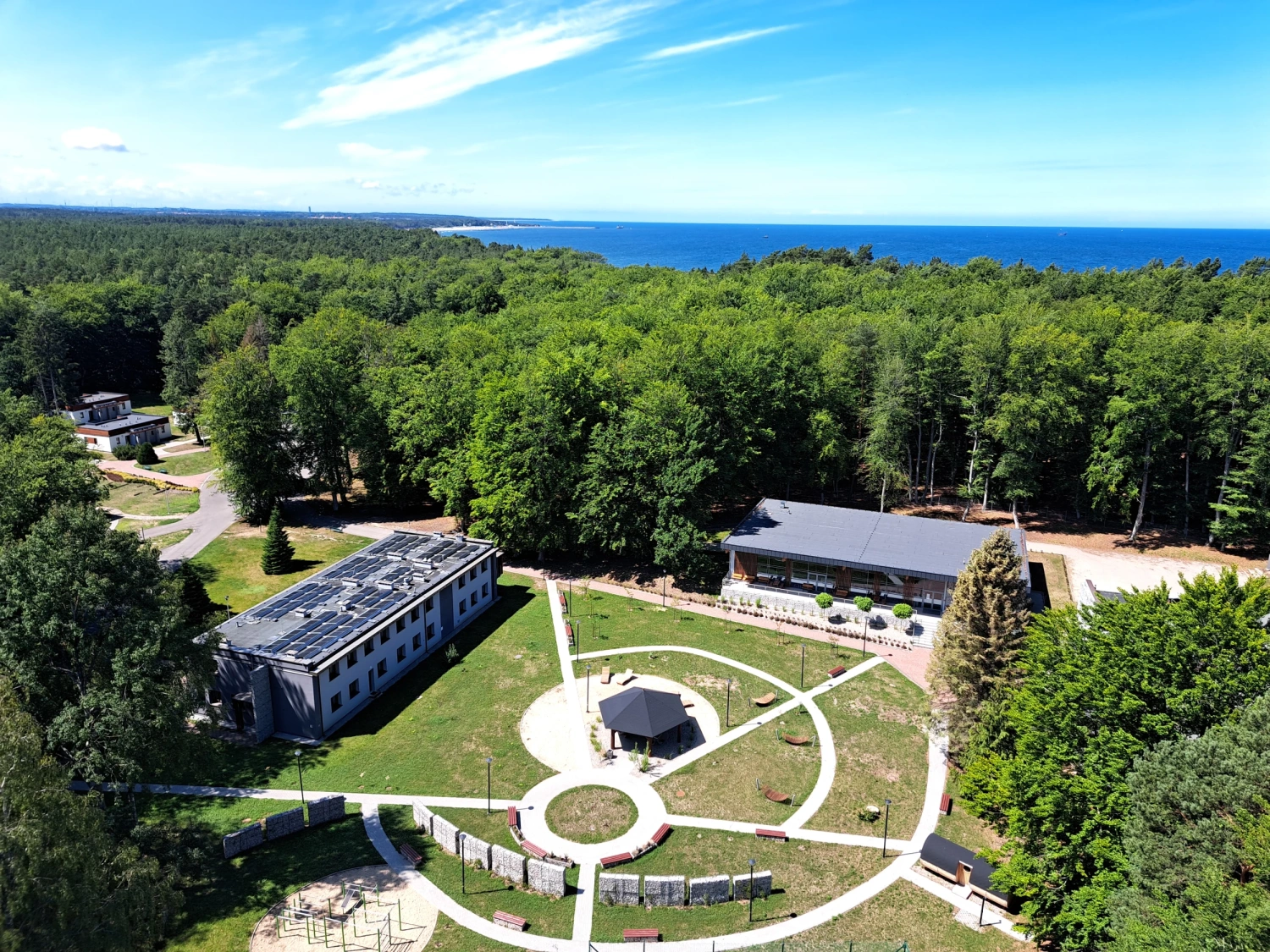 Część zewnętrzna ośrodka obejmuje rozbudowaną infrastrukturę sportowo-rekreacyjną. Do dyspozycji Gości pozostają kort tenisowy, boiska do piłki plażowej, pole do minigolfa, strefa street workout, siłownia plenerowa oraz plac zabaw.
