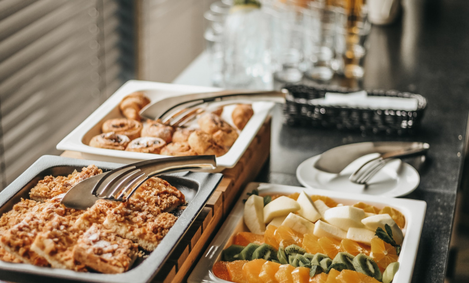 aromatyczna kawa i herbata, soki, ciasta, wypieki oraz owoce. Wieczorami można