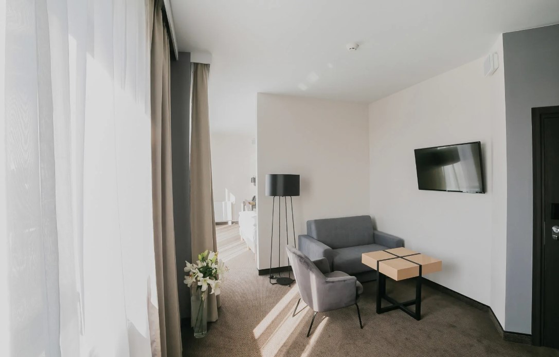 Każde z nowoczesnych pomieszczeń zostało kompleksowo wyposażone i zapewnia pełen wypoczynek w wygodnych warunkach.