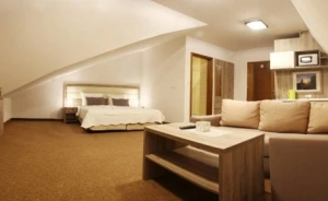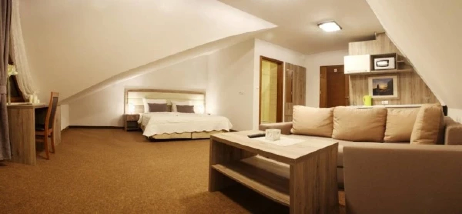 Pokój Studio składa się z dwóch oddzielnych pomieszczeń połączonych drzwiami wewnętrznymi. W jednym znajdują się łóżka, a w drugim rozkładana narożna sofa, stolik i TV.