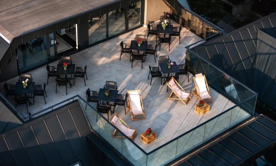 Ważnym punktem oferty jest taras na dachu - elegancka, otwarta przestrzeń z panoramicznym widokiem na Tatry, idealna zarówno do relaksu, jak i kameralnych spotkań.